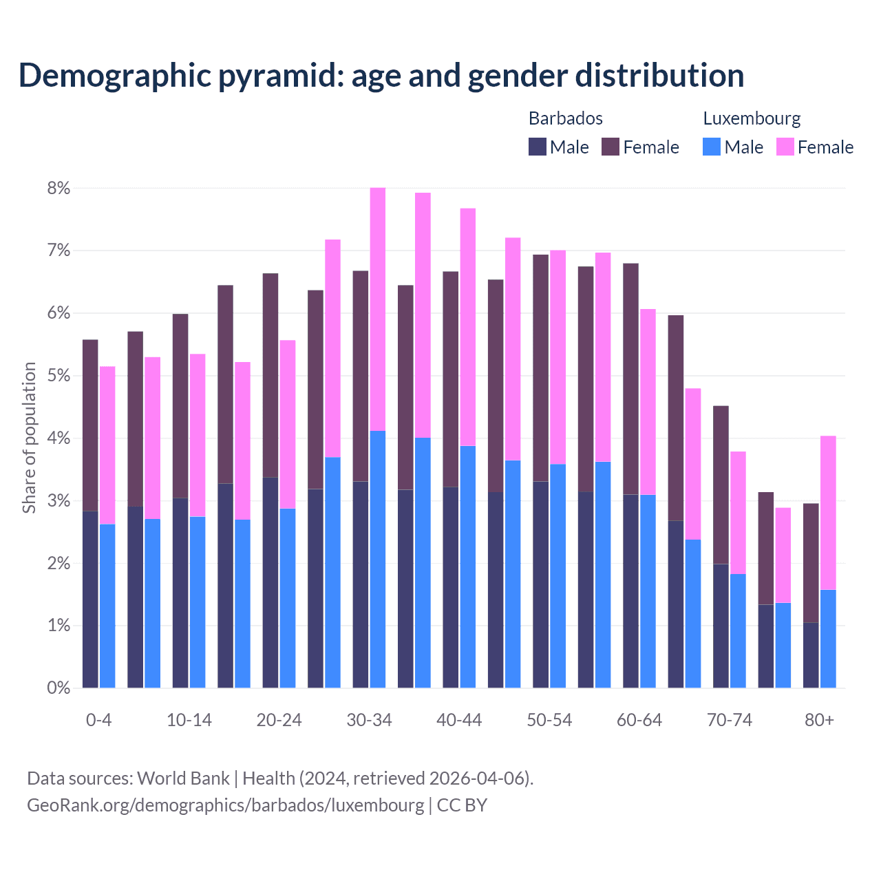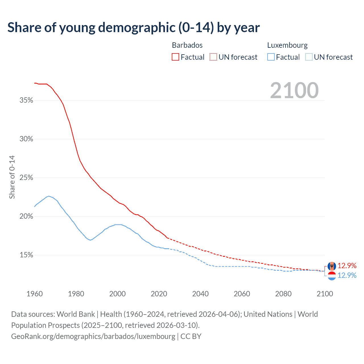 - The share of young demographic (0-15 years old) in Barbados is 17.2% vs 15.8% in Luxembourg.