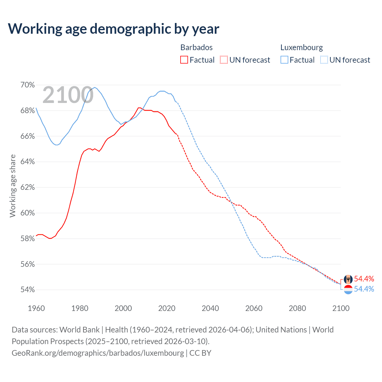 Median age Barbados vs Luxembourg, 1960-2100