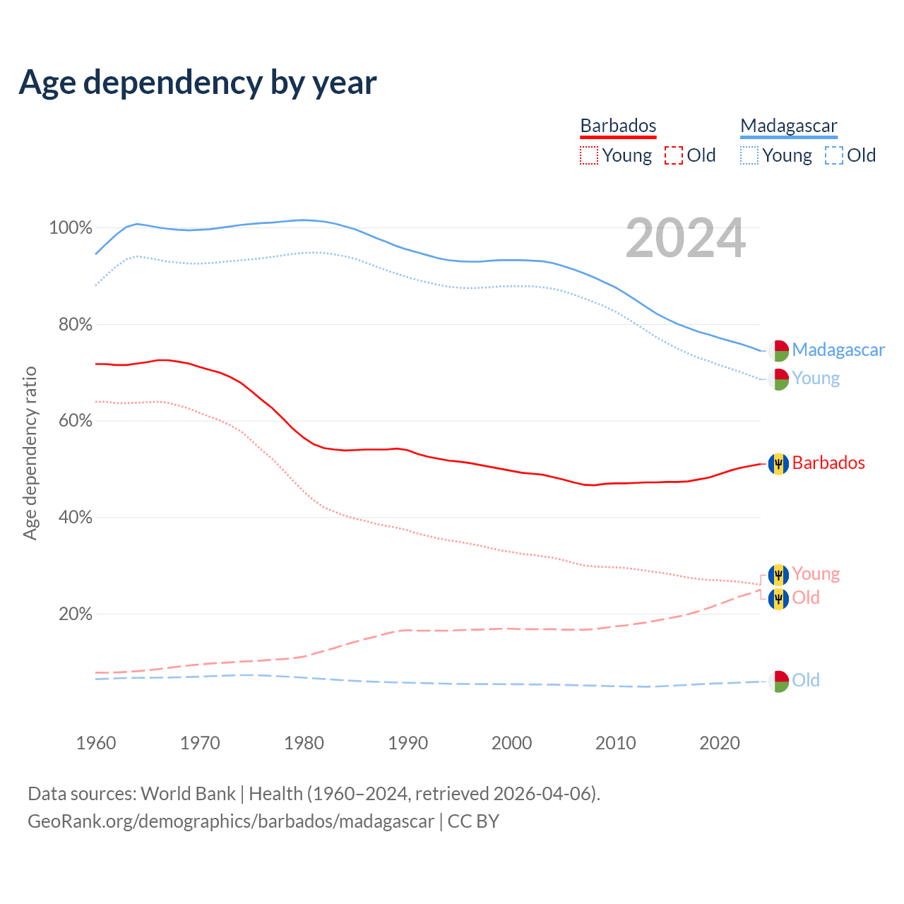 - The share of old-age demographic (65+) in Barbados is 16.6% vs 3.41% in Madagascar.