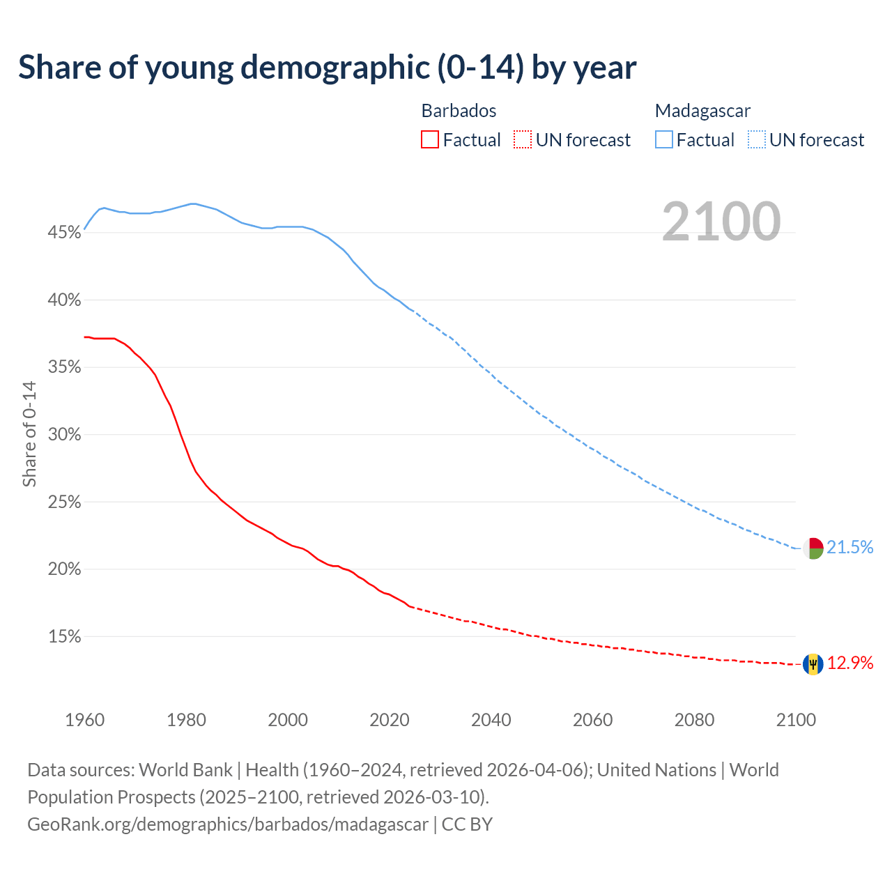 - The share of young demographic (0-15 years old) in Barbados is 17.2% vs 39.3% in Madagascar.