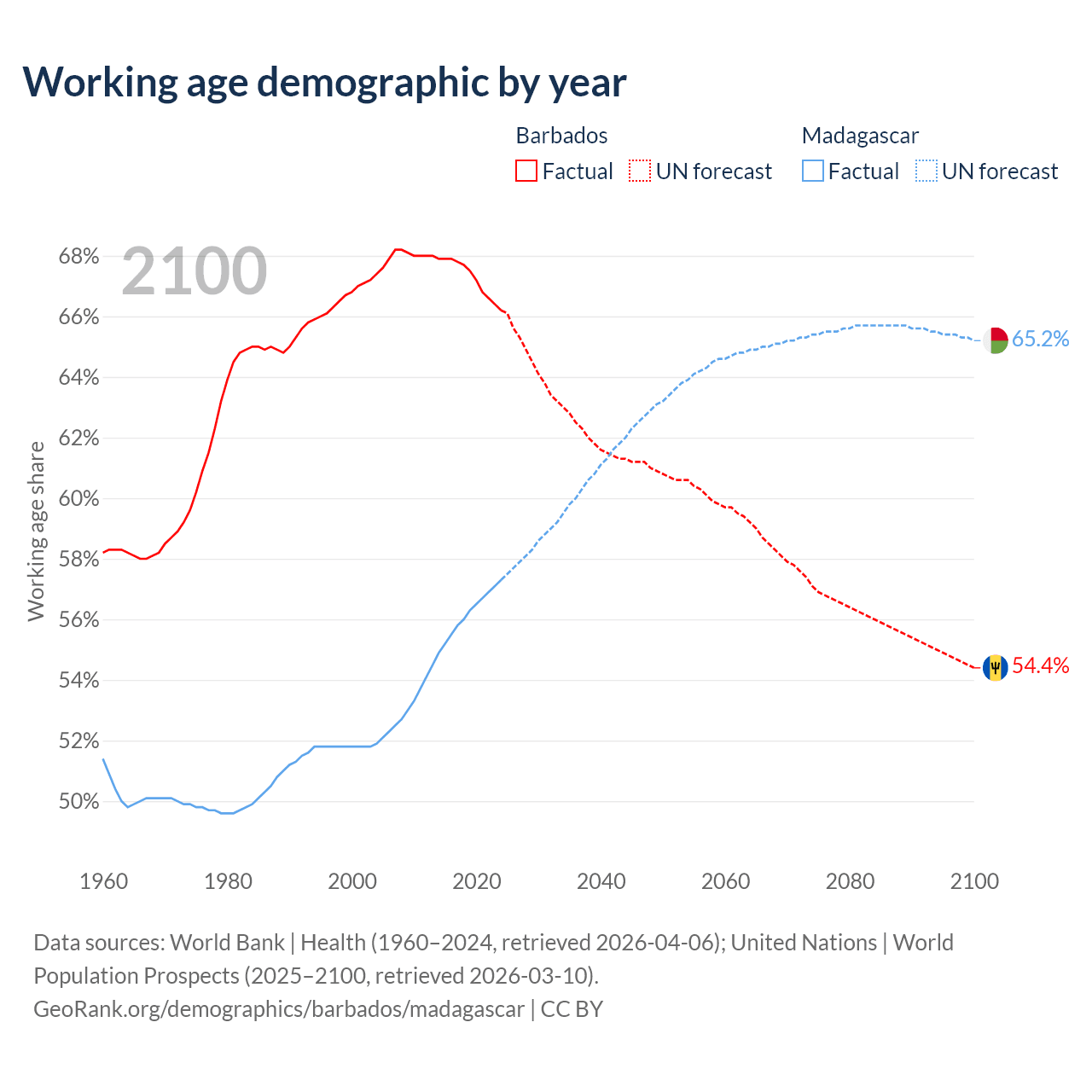 Median age Barbados vs Madagascar, 1960-2100