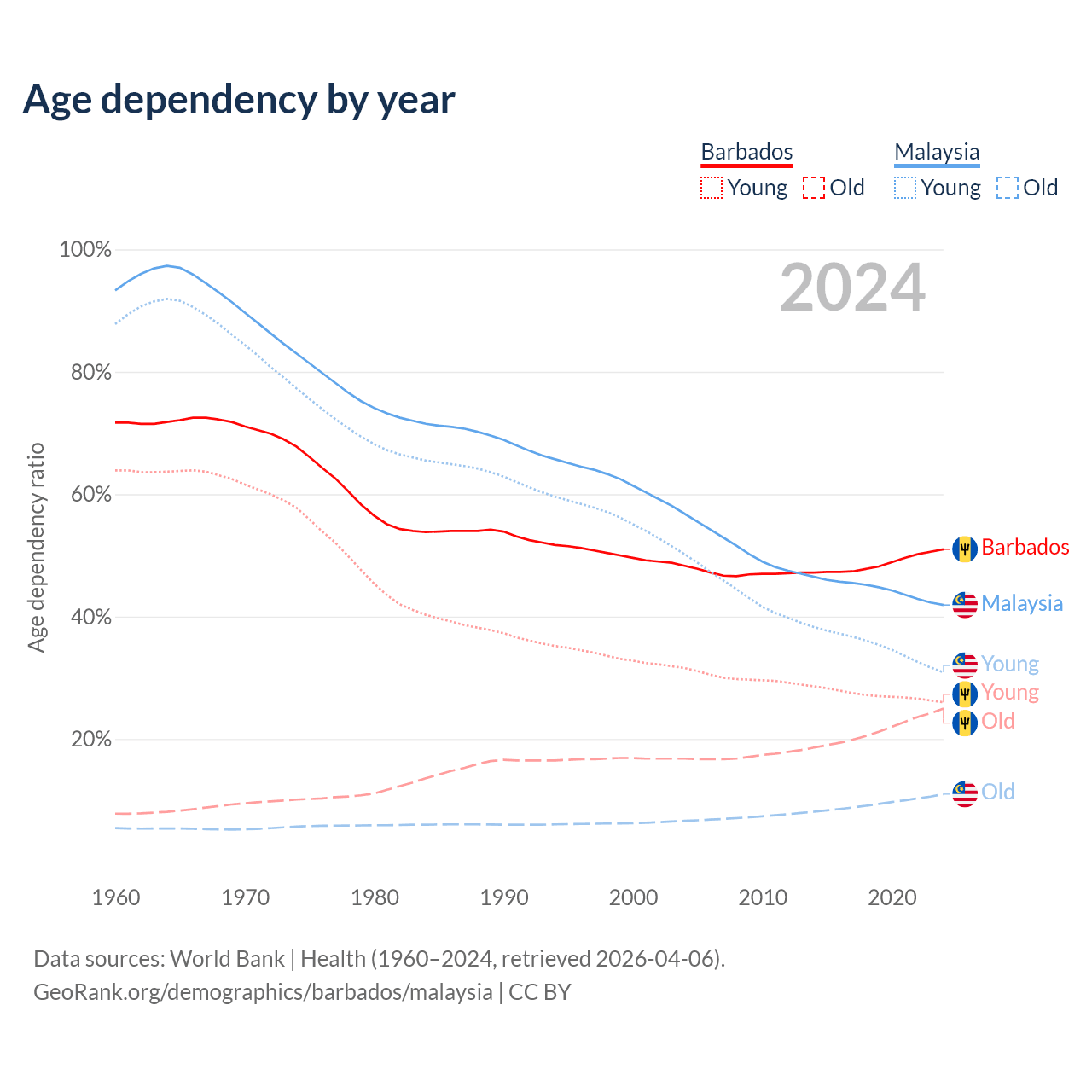 - Barbados is ranked 47/196 by median age (oldest to youngest) vs 92/196 for Malaysia.