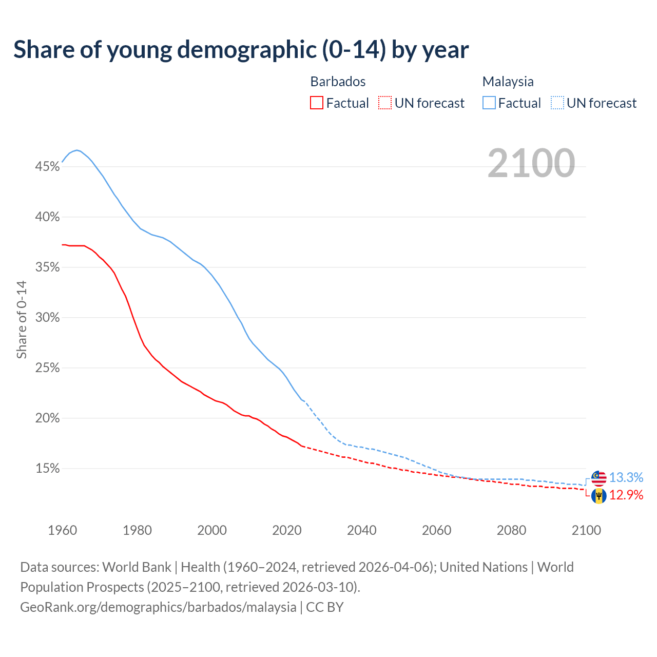 - The share of young demographic (0-15 years old) in Barbados is 17.2% vs 21.8% in Malaysia.