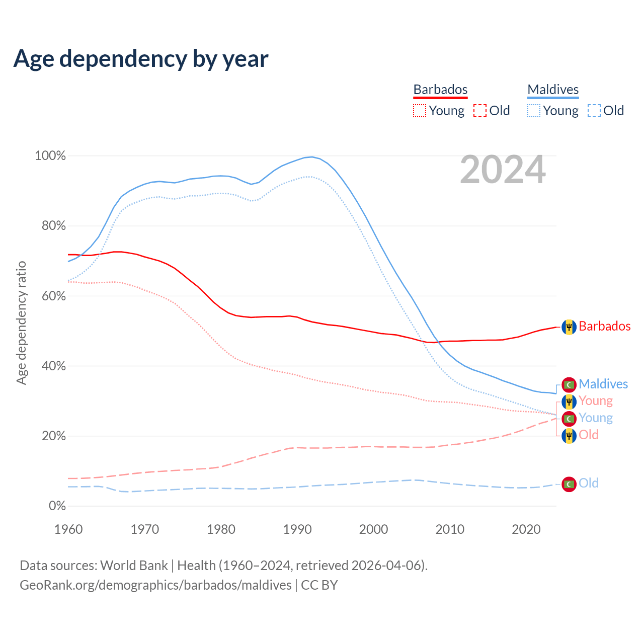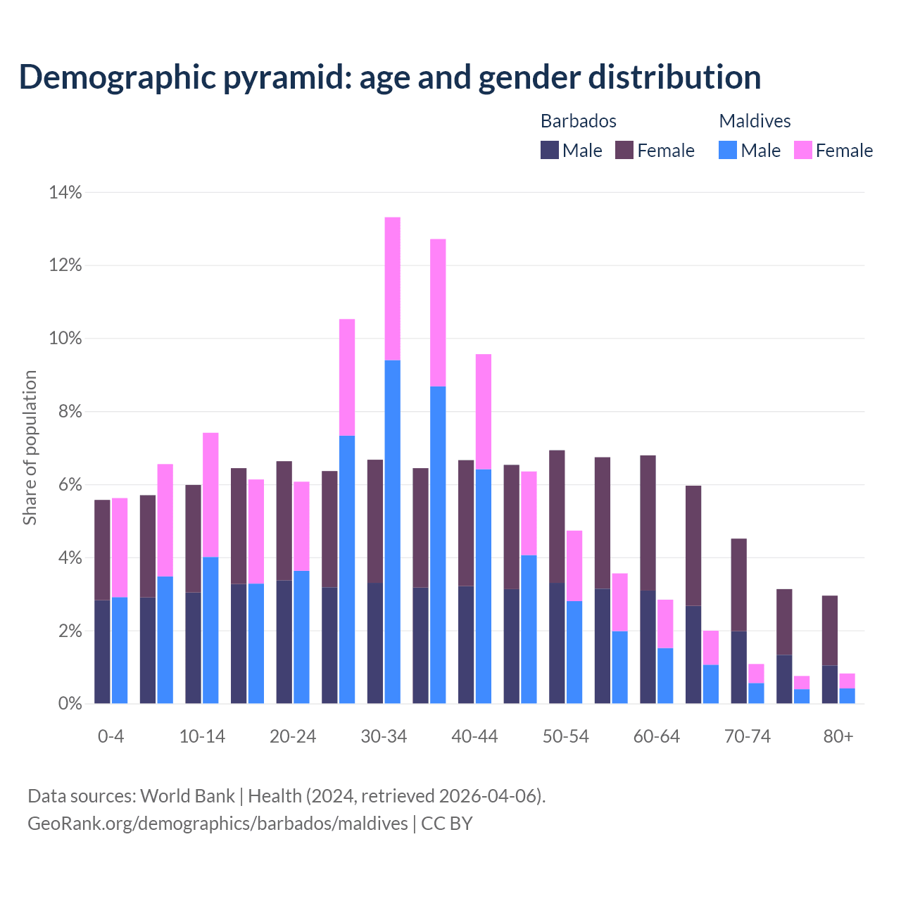 - Barbados is ranked 47/196 by median age (oldest to youngest) vs 90/196 for Maldives.