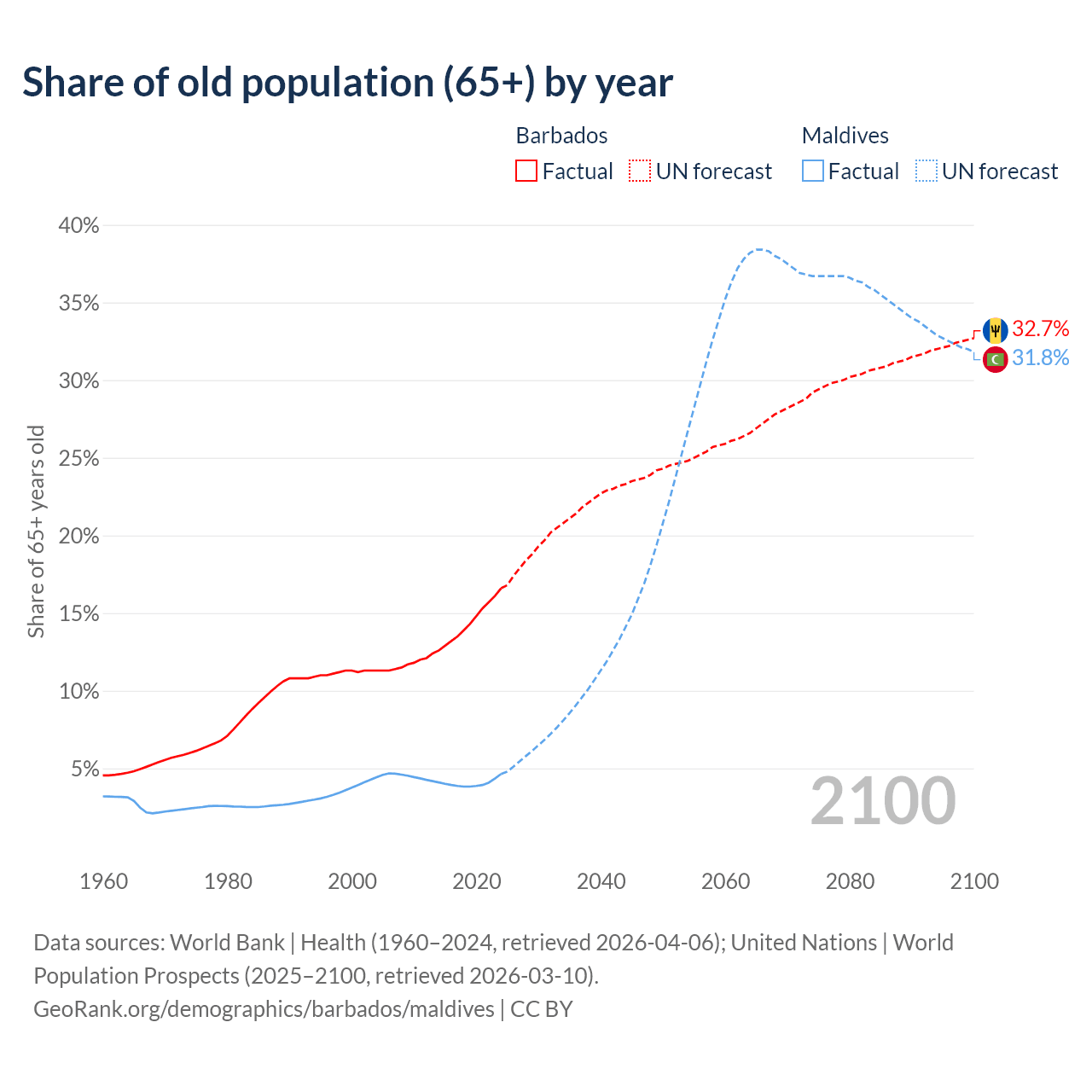 - The share of old-age demographic (65+) in Barbados is 16.6% vs 4.64% in Maldives.