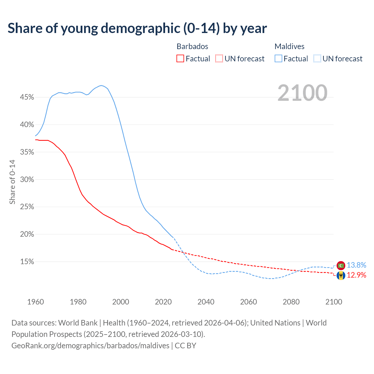 - The share of young demographic (0-15 years old) in Barbados is 17.2% vs 19.6% in Maldives.