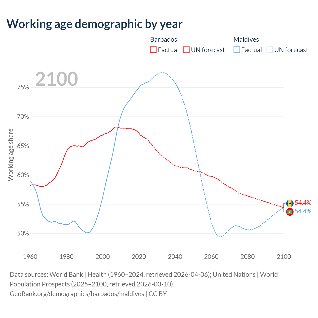 - Barbados has 187K working age adults (aged 15-64) vs 403K in Maldives.