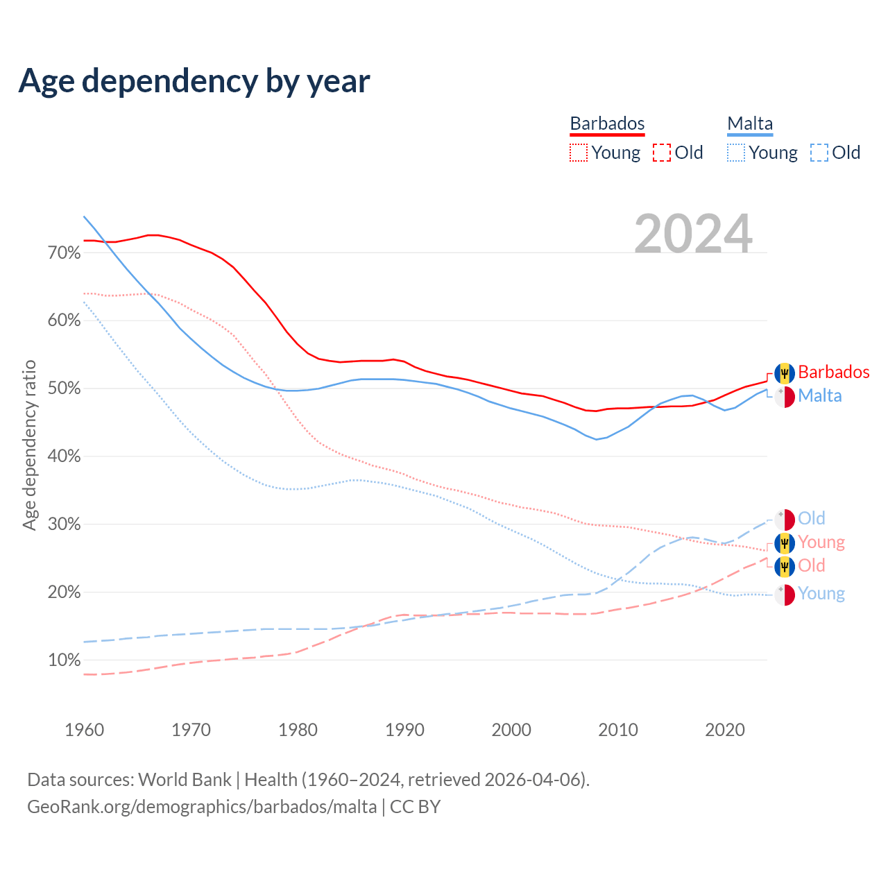 The share of older people aged 65 and over is 16.6% in Barbados and 20.2% in Malta. Life expectancy in Barbados compared to Malta .