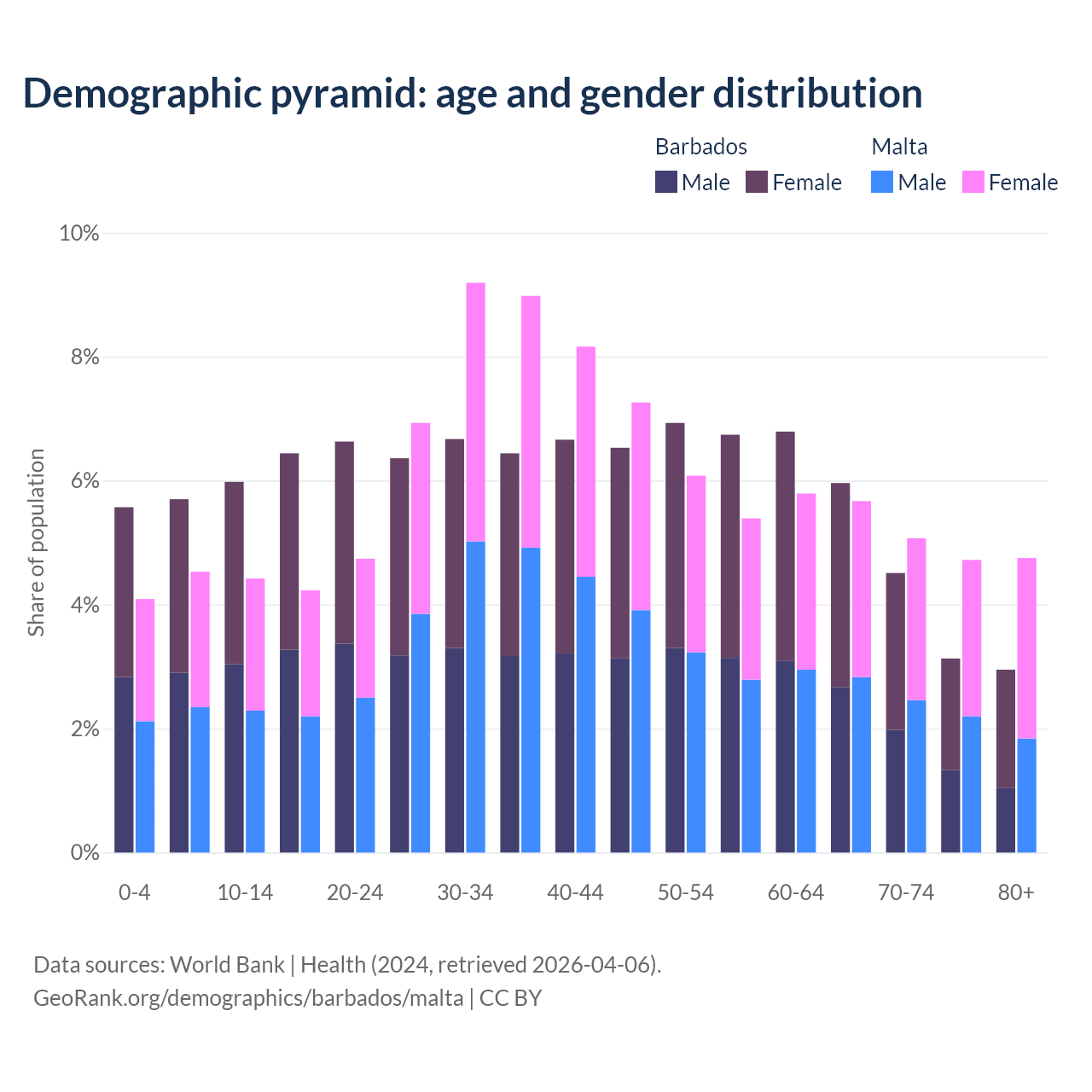 - Barbados is ranked 47/196 by median age (oldest to youngest) vs 36/196 for Malta.
