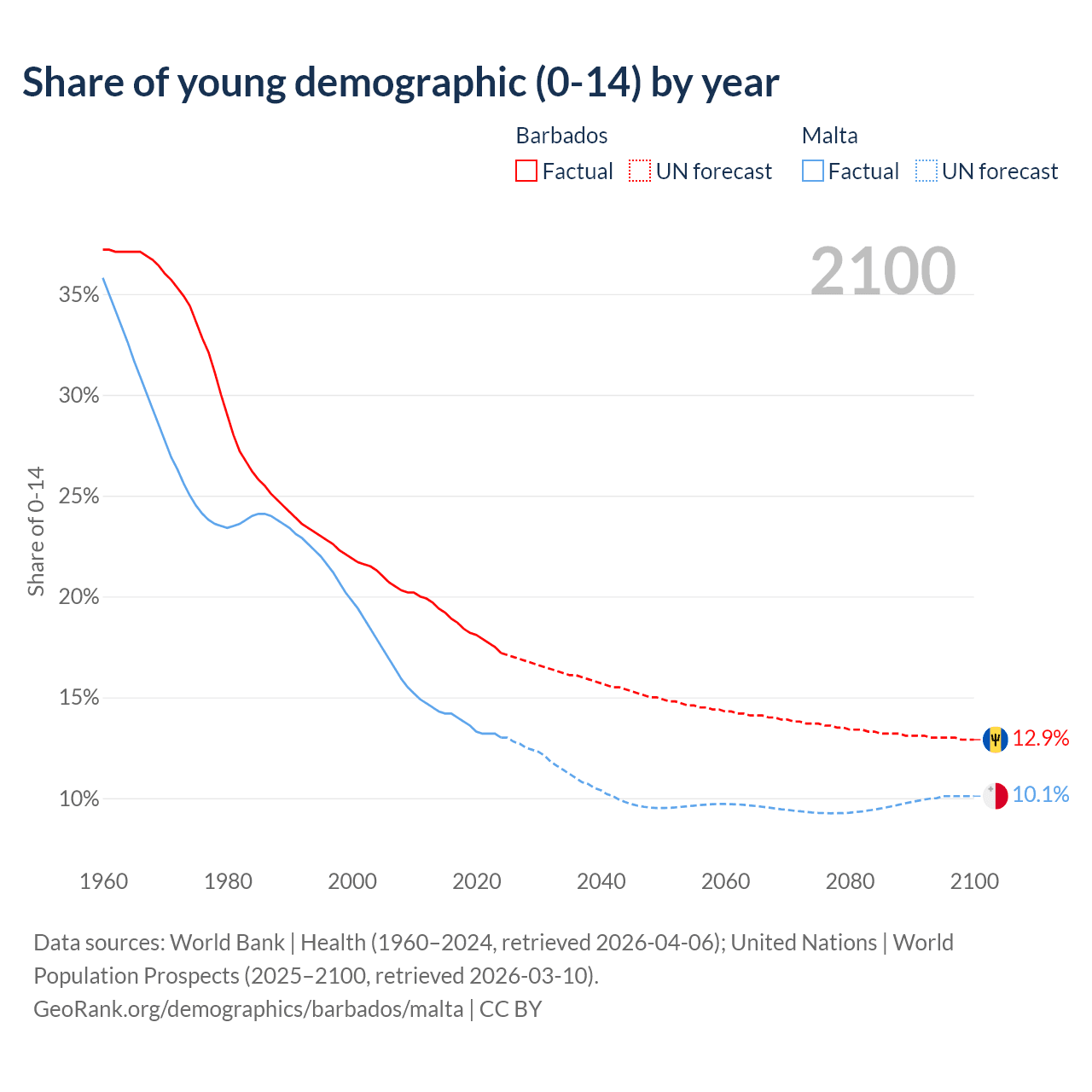 - The share of young demographic (0-15 years old) in Barbados is 17.2% vs 13% in Malta.