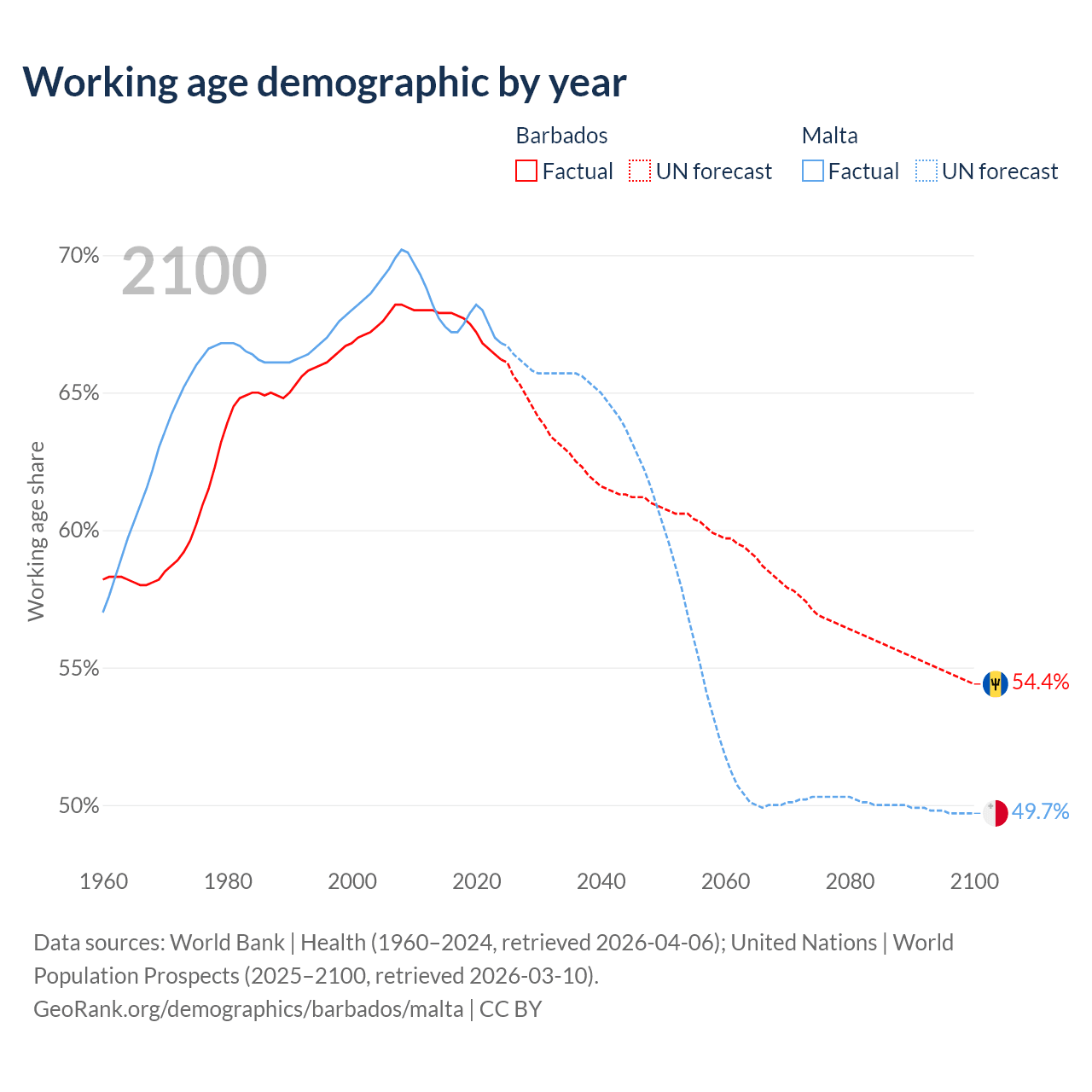 Median age Barbados vs Malta, 1960-2100