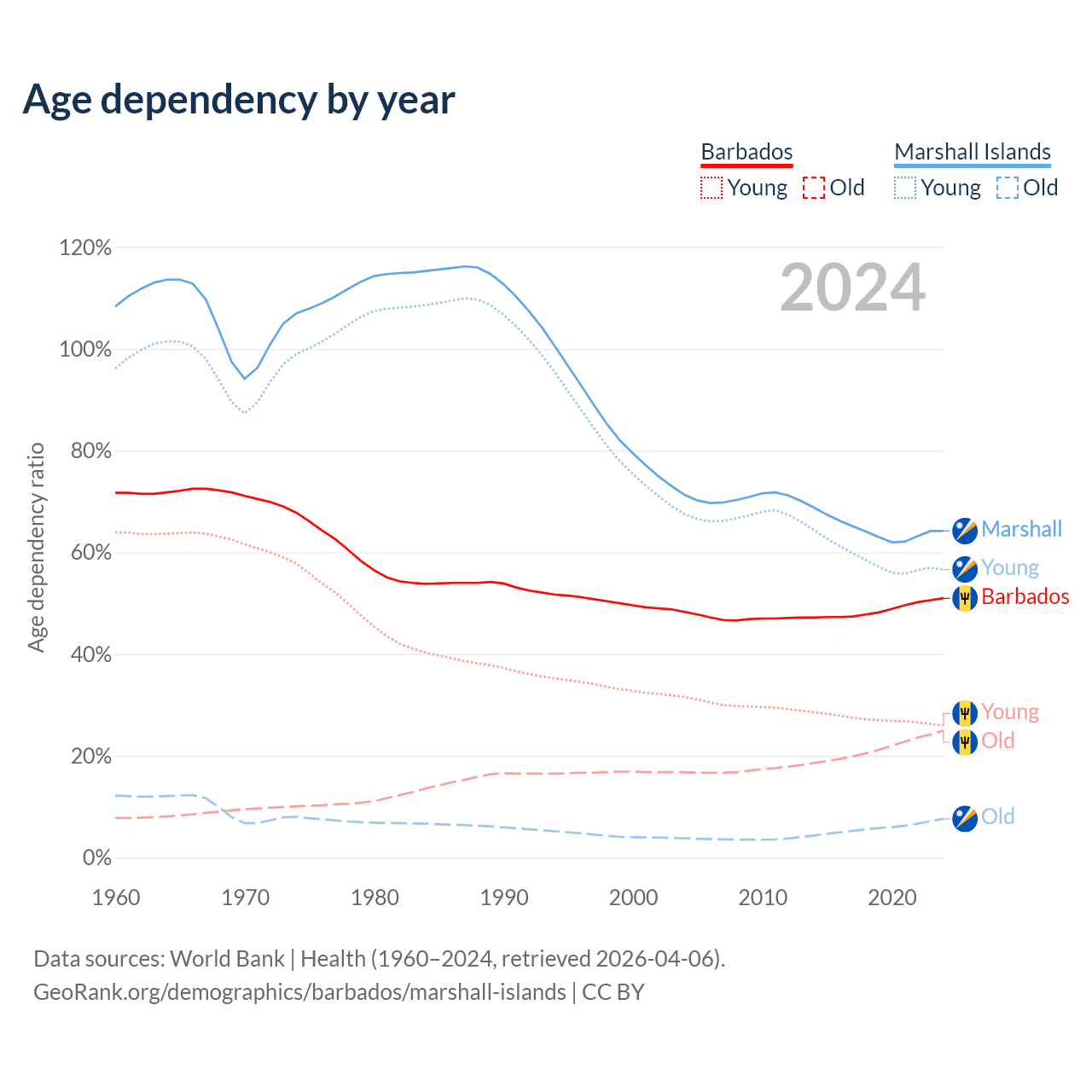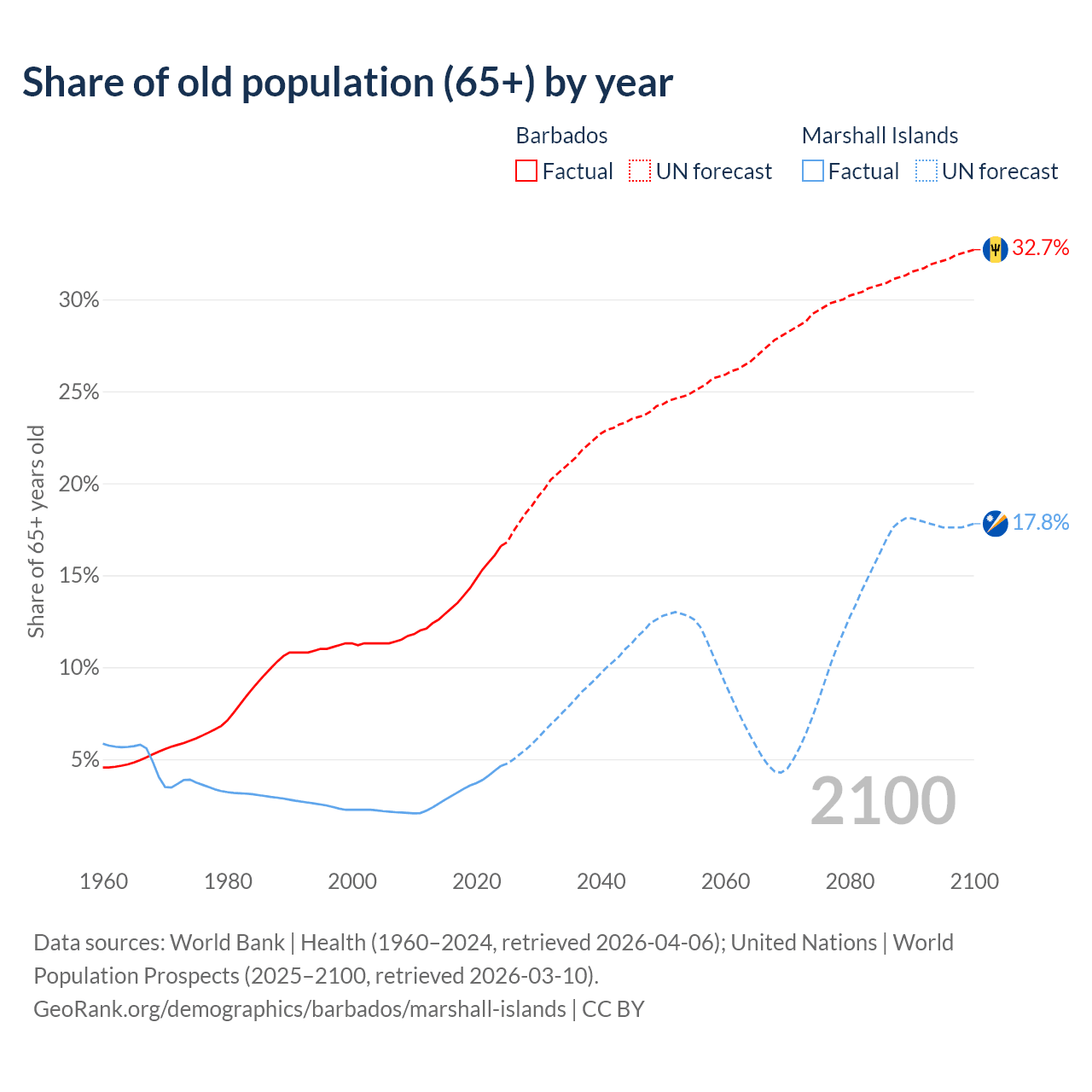- The share of old-age demographic (65+) in Barbados is 16.6% vs 4.64% in the Marshall Islands.
