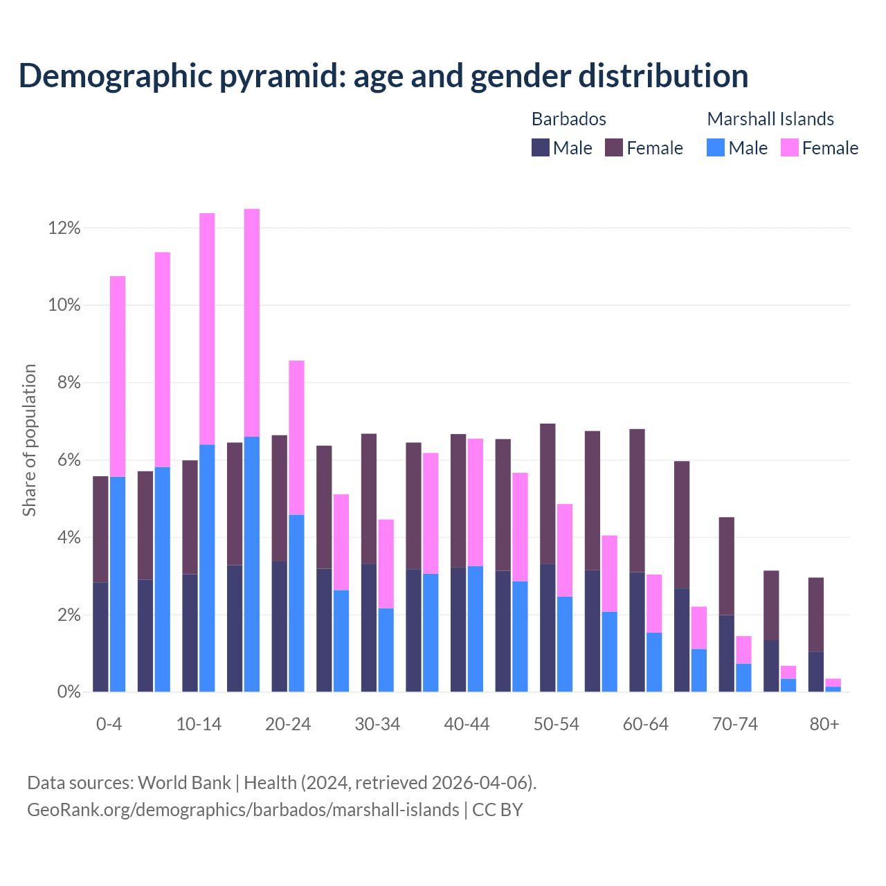 - Barbados is ranked 47/196 by median age (oldest to youngest) vs 150/196 for the Marshall Islands.