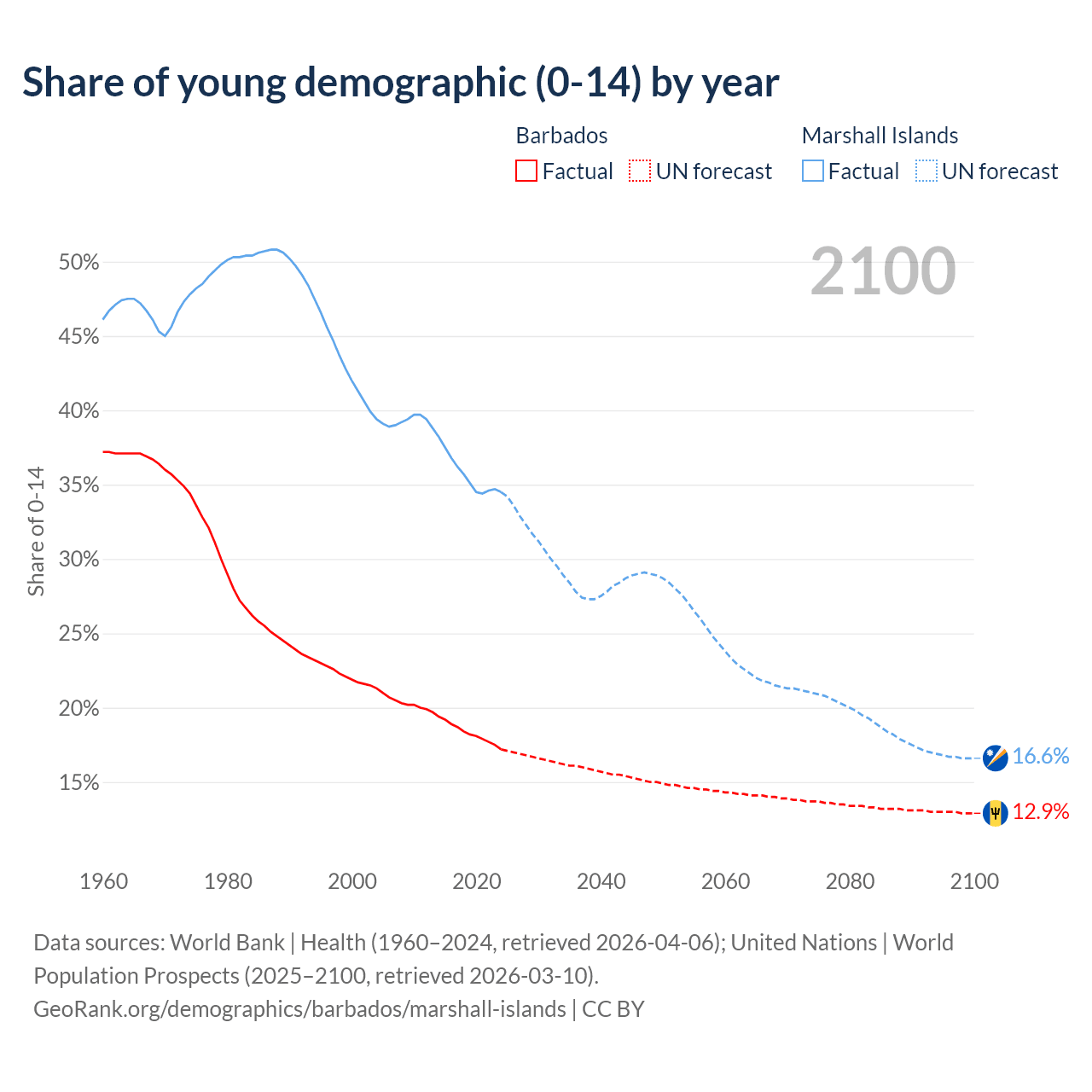 - The share of young demographic (0-15 years old) in Barbados is 17.2% vs 34.5% in the Marshall Islands.