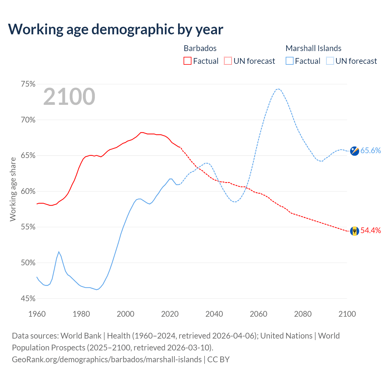 - Barbados has 187K working age adults (aged 15-64) vs 21.3K in the Marshall Islands.