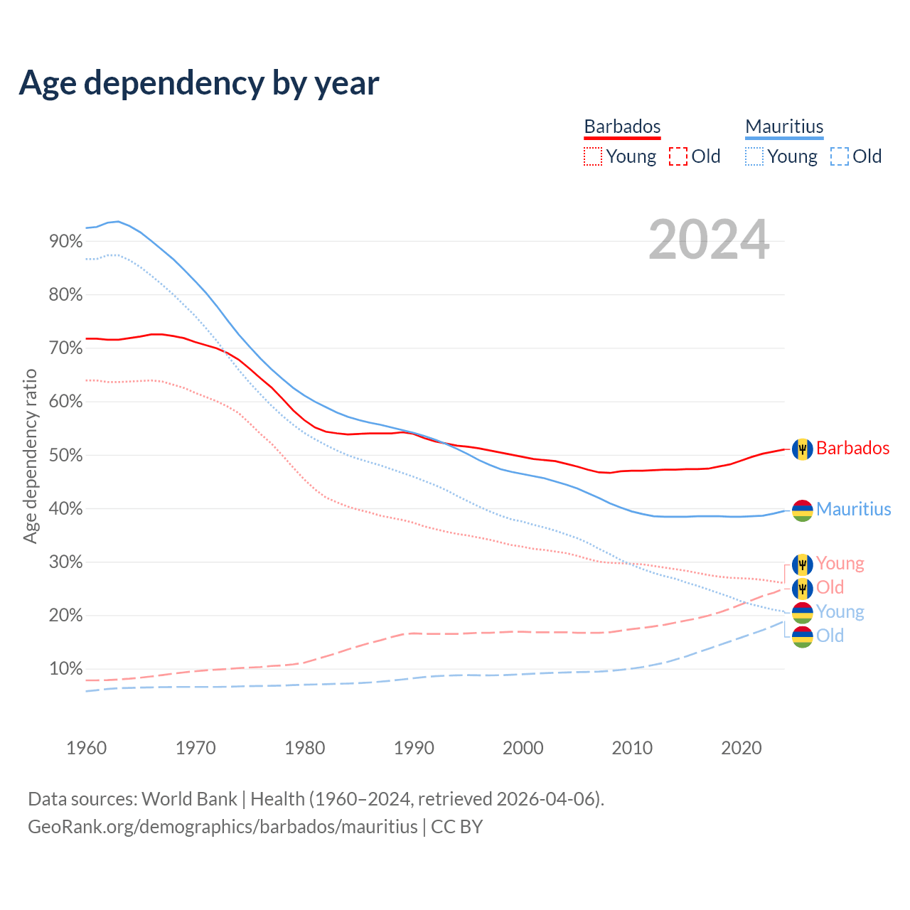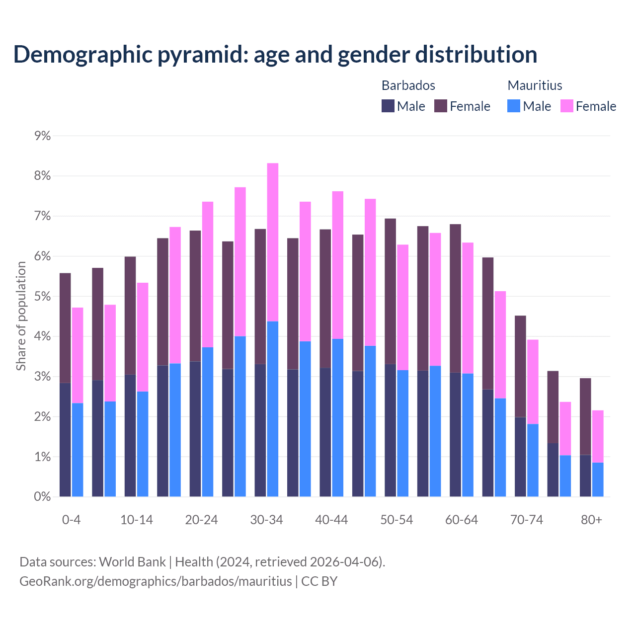 - Barbados is ranked 47/196 by median age (oldest to youngest) vs 57/196 for Mauritius.