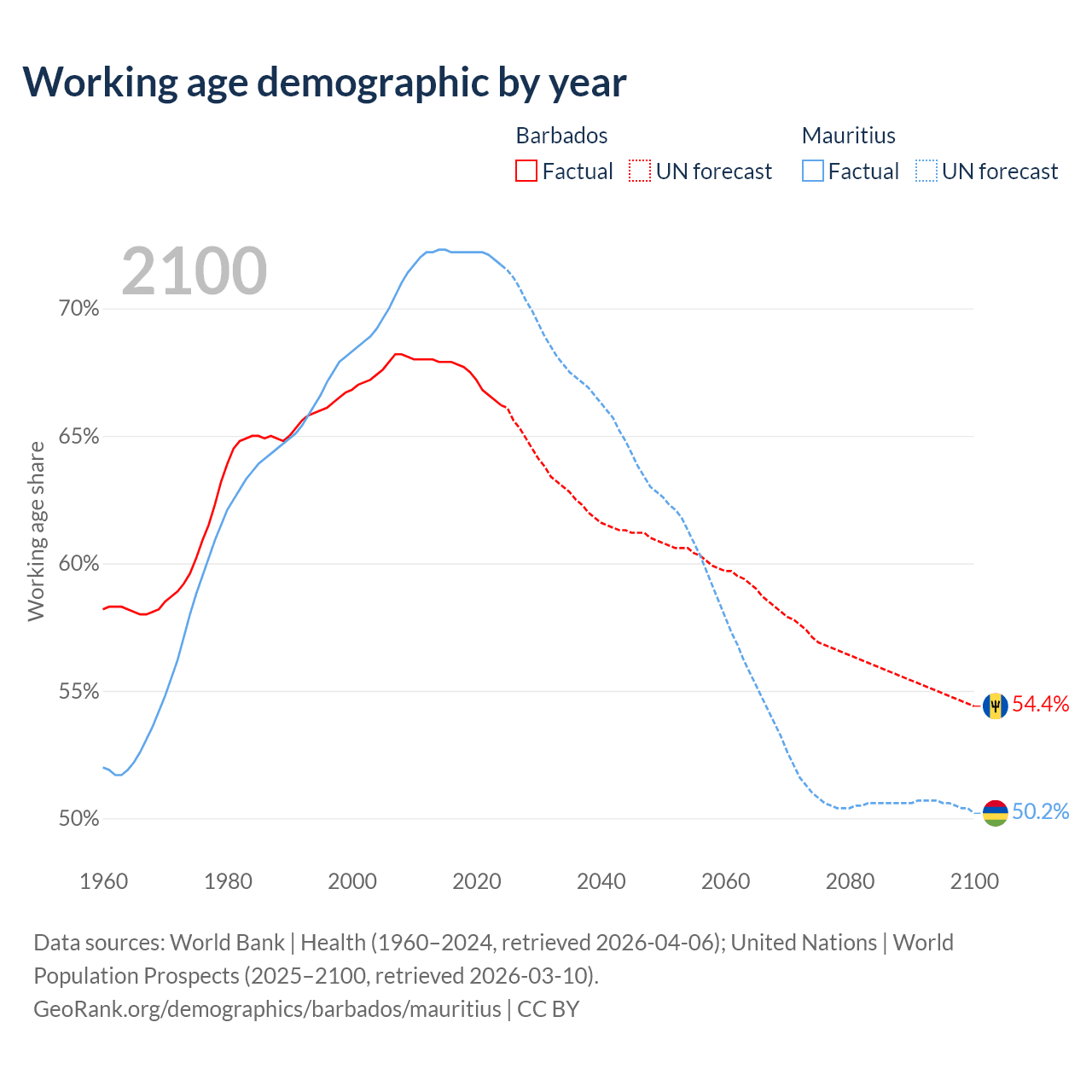 Median age Barbados vs Mauritius, 1960-2100