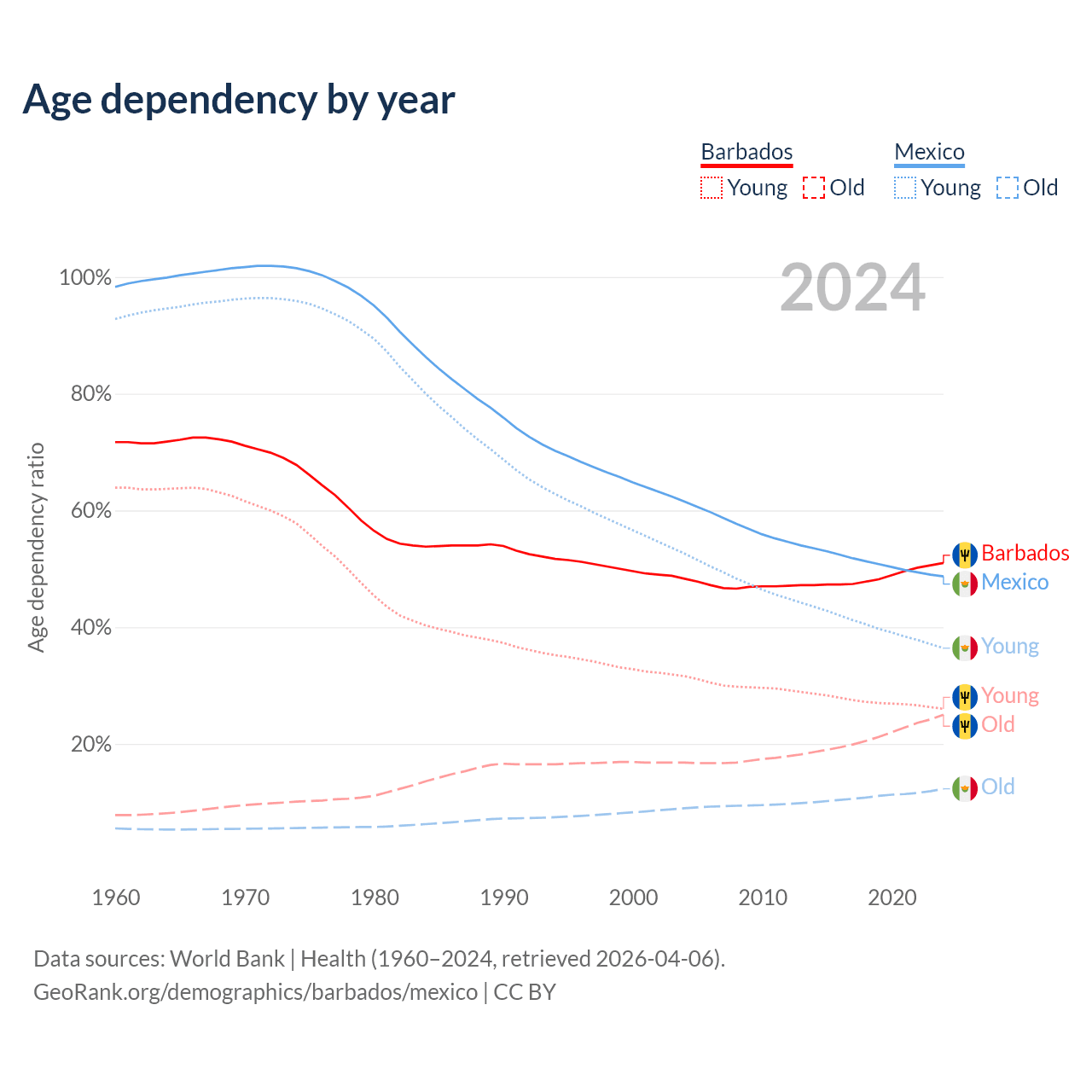 - Barbados is ranked 47/196 by median age (oldest to youngest) vs 102/196 for Mexico.