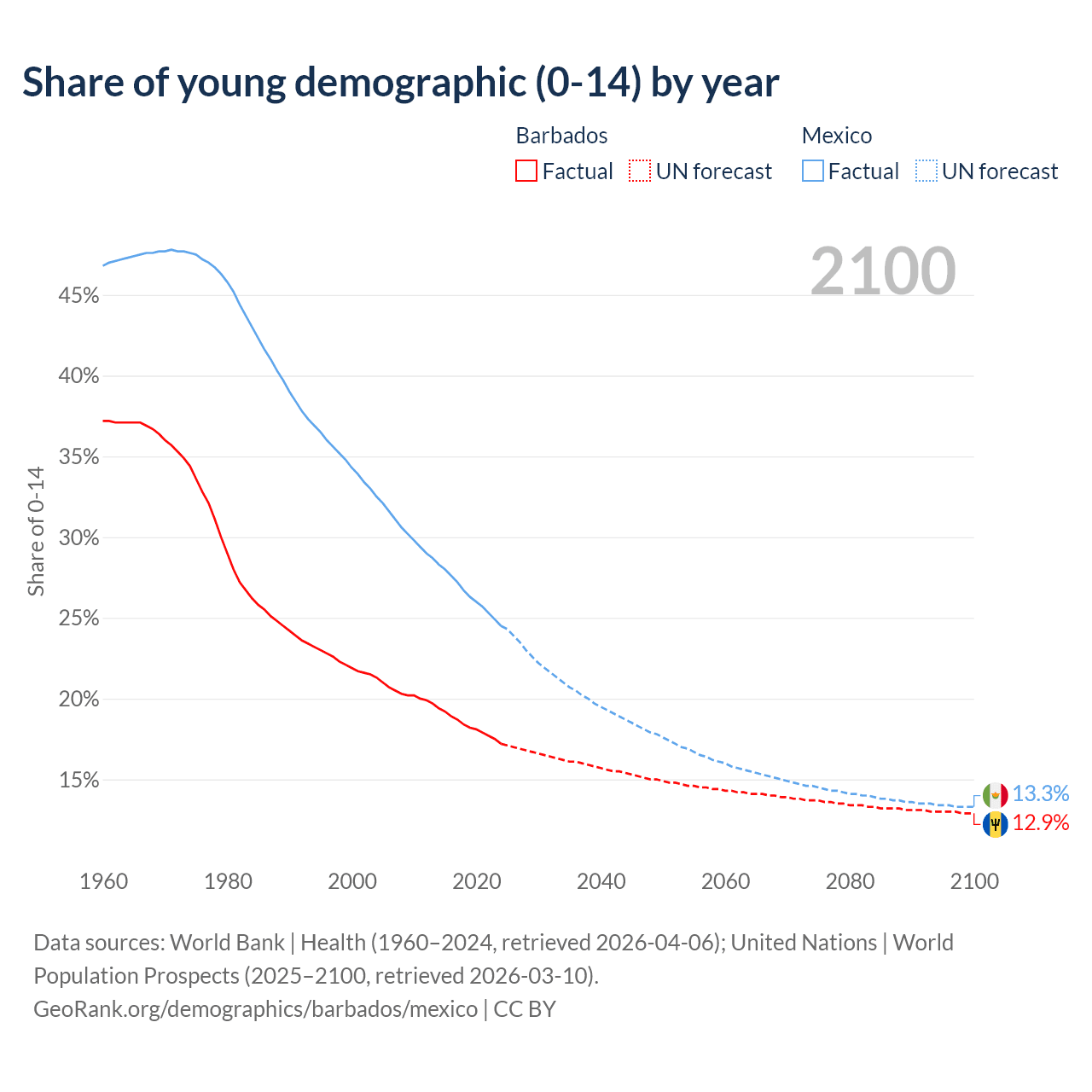 - The share of young demographic (0-15 years old) in Barbados is 17.2% vs 24.5% in Mexico.