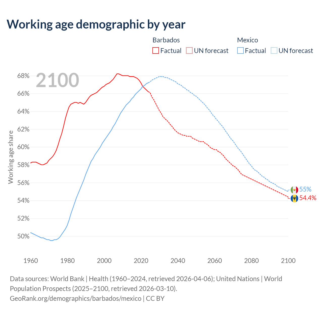 Median age Barbados vs Mexico, 1960-2100