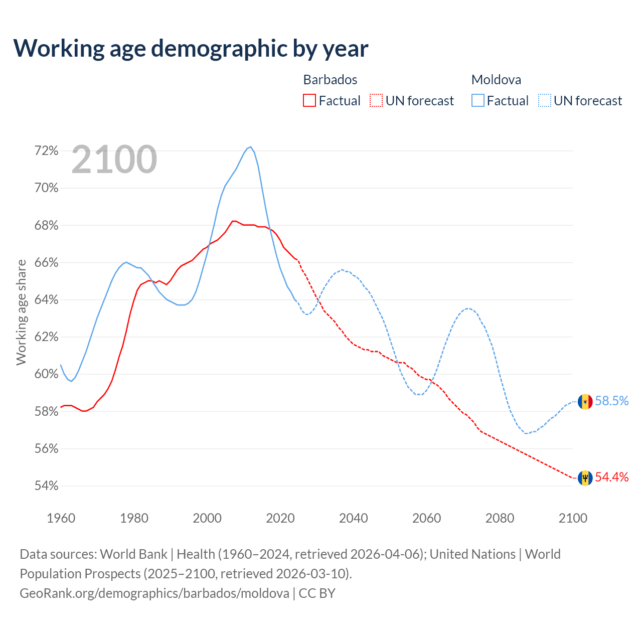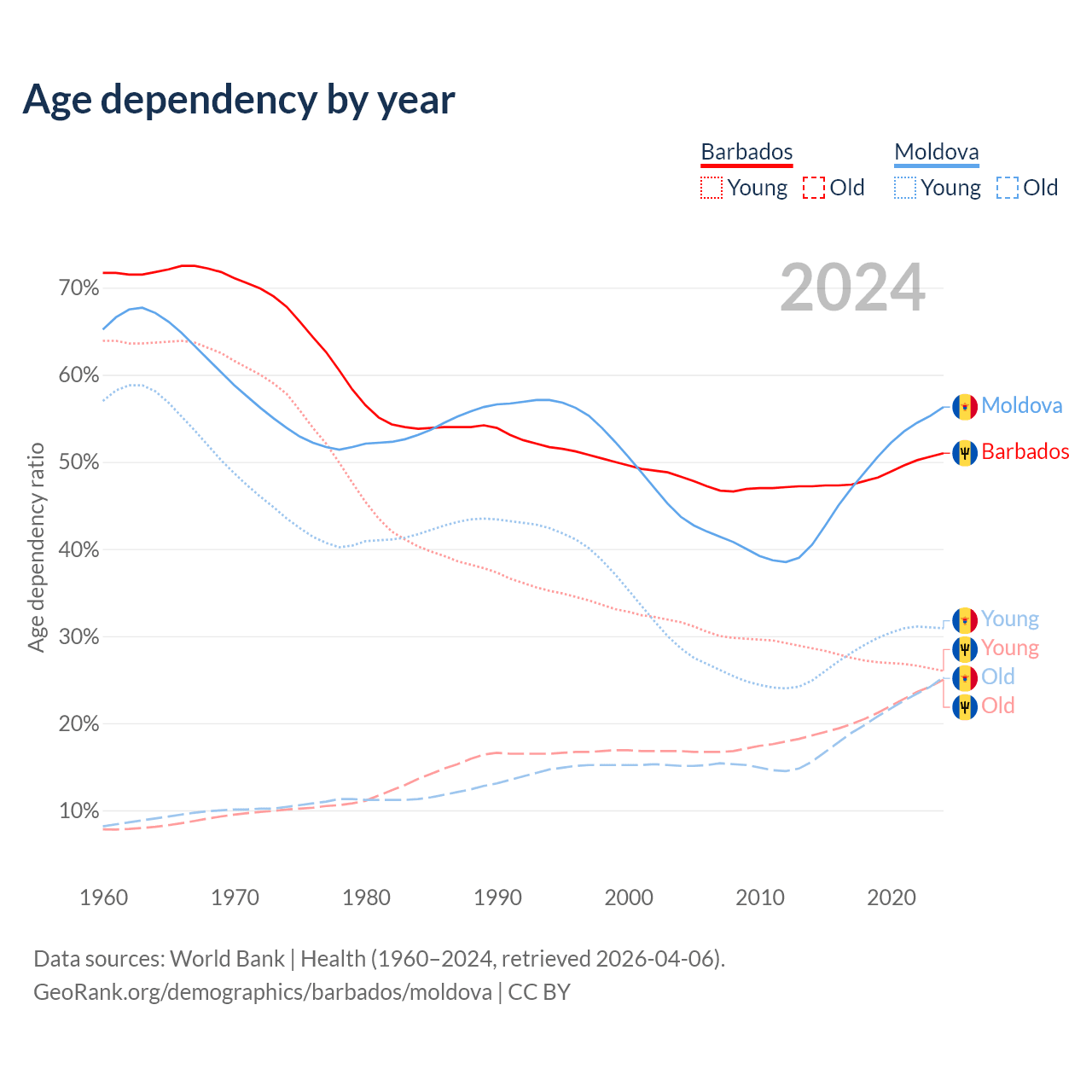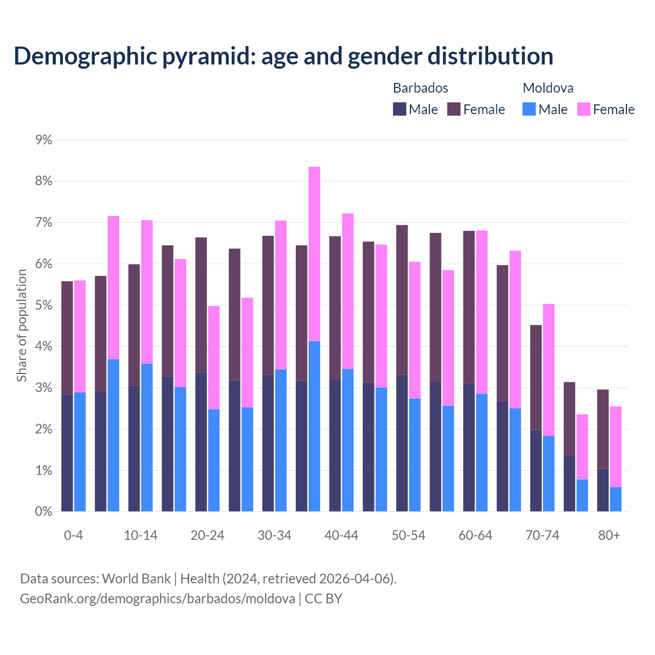 - Barbados is ranked 47/196 by median age (oldest to youngest) vs 54/196 for Moldova.