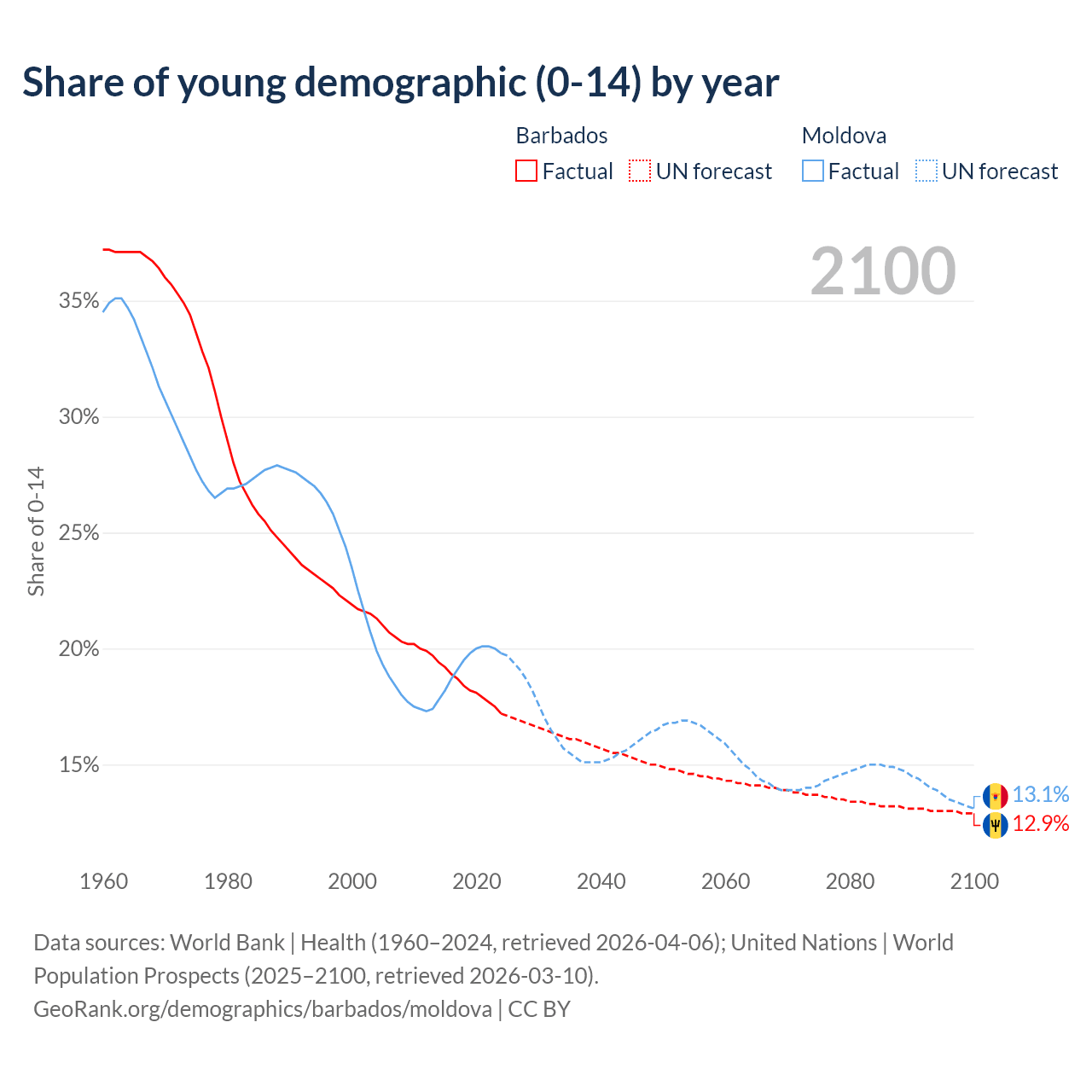 - The share of young demographic (0-15 years old) in Barbados is 17.2% vs 19.8% in Moldova.