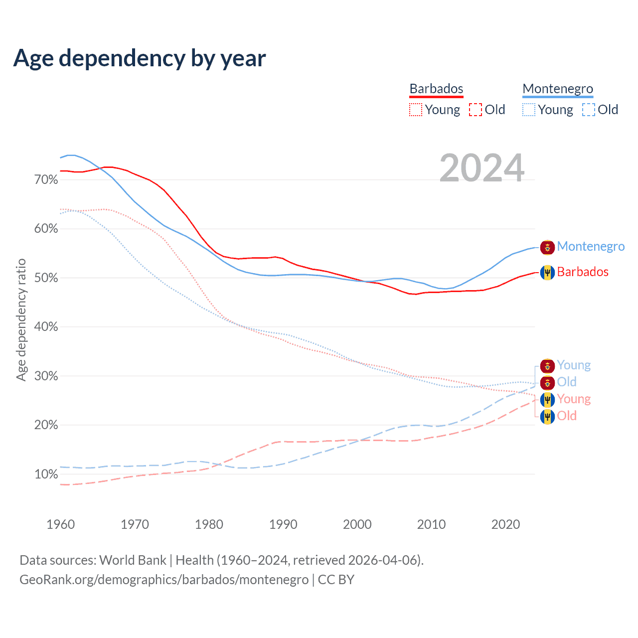 - Barbados is ranked 47/196 by median age (oldest to youngest) vs 45/196 for Montenegro.