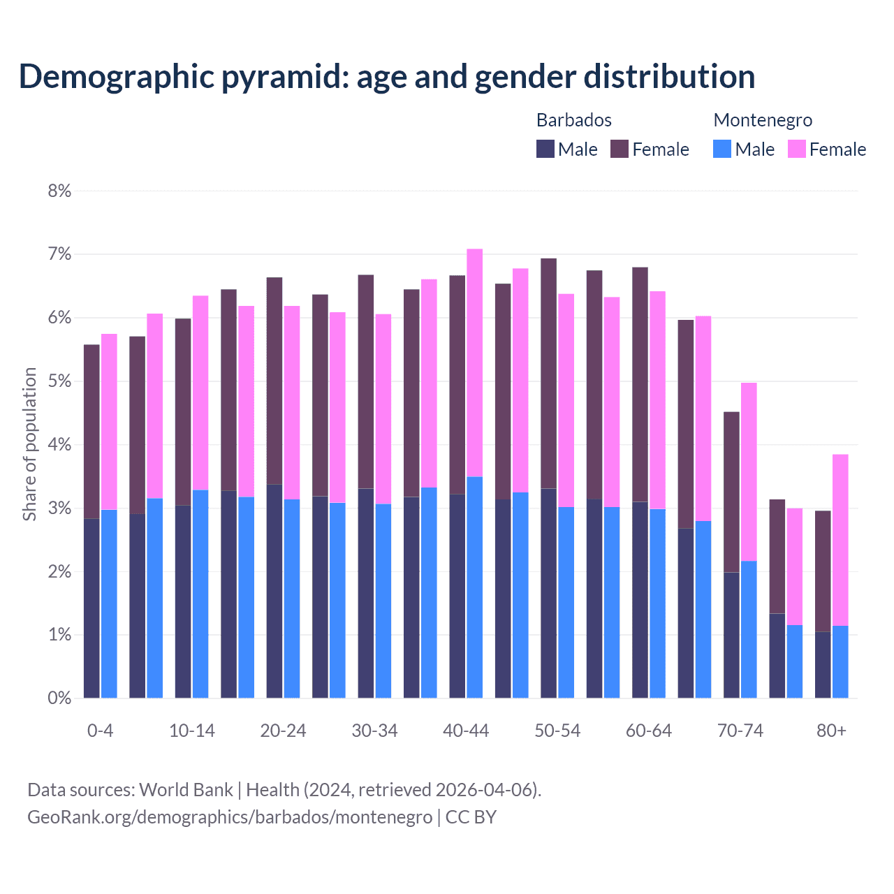 The share of older people aged 65 and over is 16.6% in Barbados and 17.8% in Montenegro. Life expectancy in Barbados compared to Montenegro .