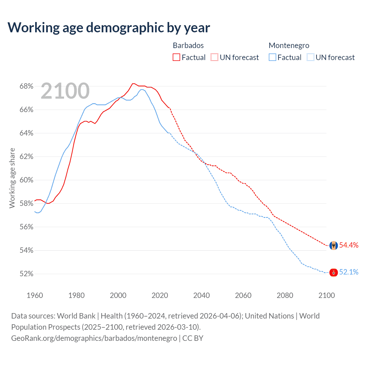 Median age Barbados vs Montenegro, 1960-2100