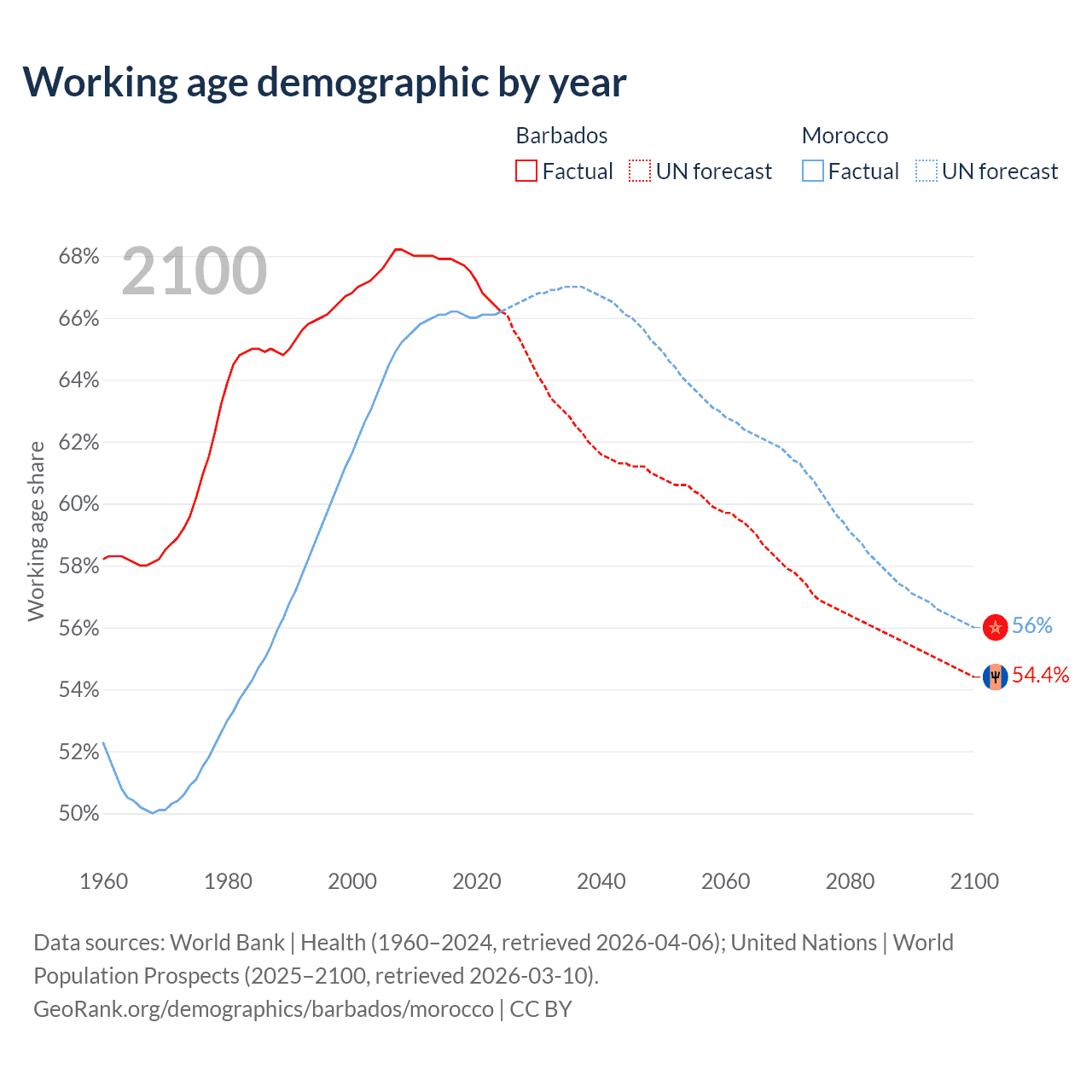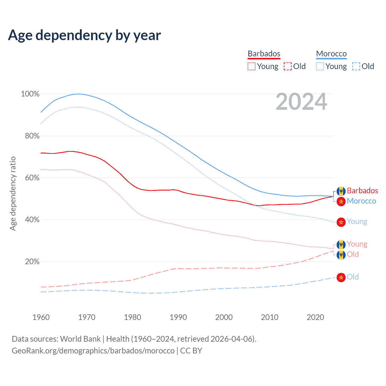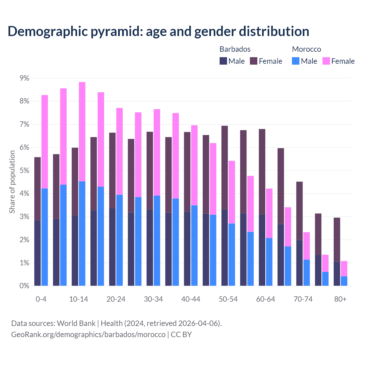 - Barbados is ranked 47/196 by median age (oldest to youngest) vs 100/196 for Morocco.