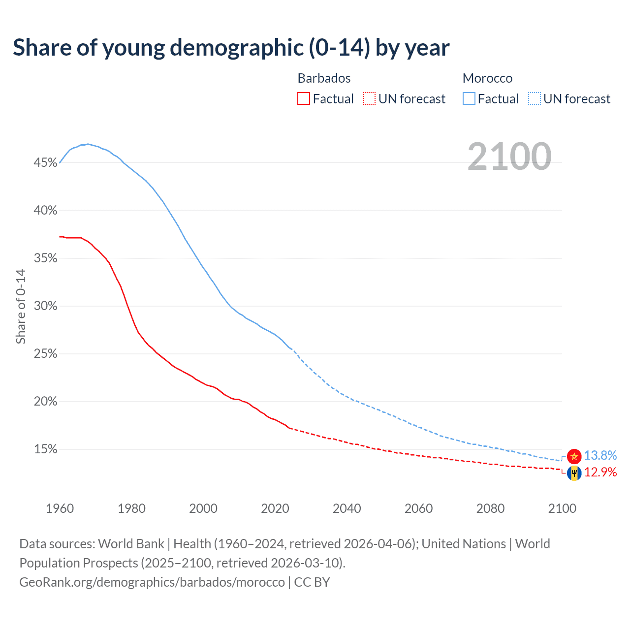 - The share of young demographic (0-15 years old) in Barbados is 17.2% vs 25.6% in Morocco.