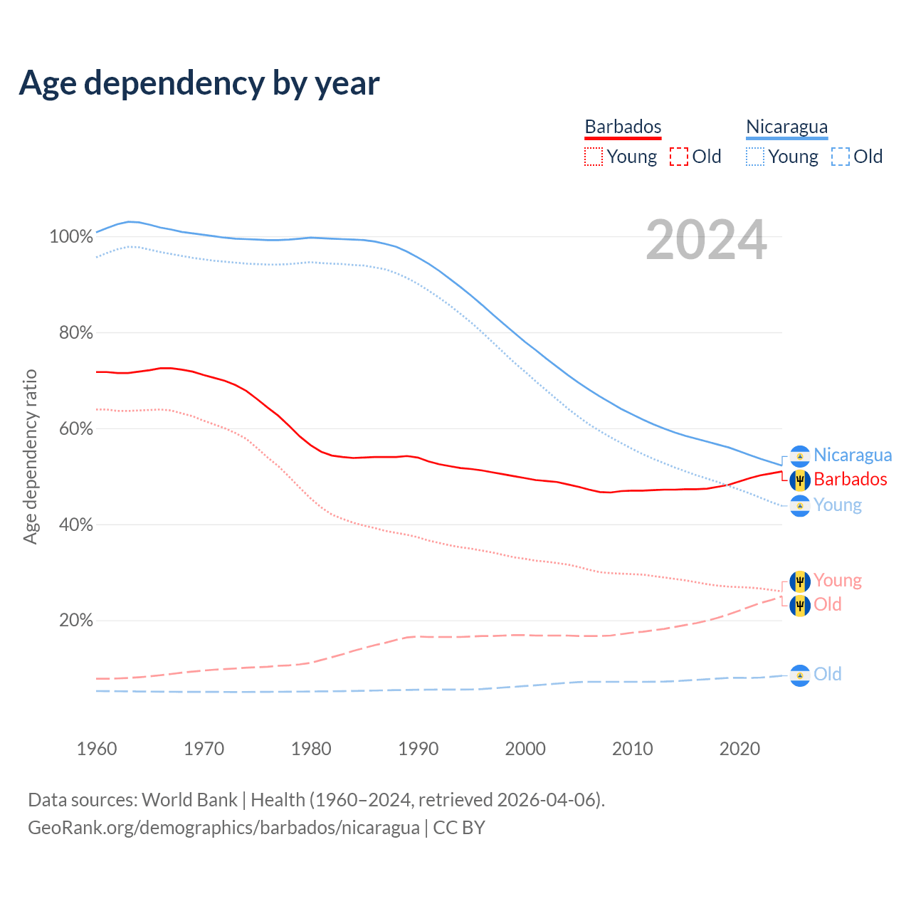 - Barbados is ranked 47/196 by median age (oldest to youngest) vs 125/196 for Nicaragua.