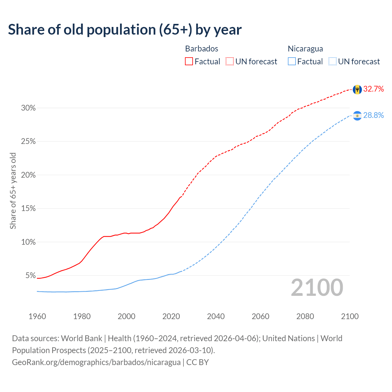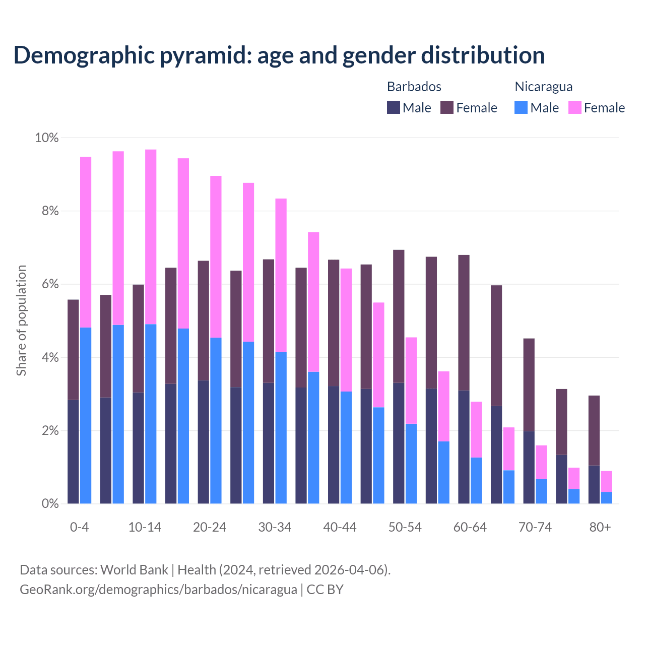 - The share of old-age demographic (65+) in Barbados is 16.6% vs 5.53% in Nicaragua.