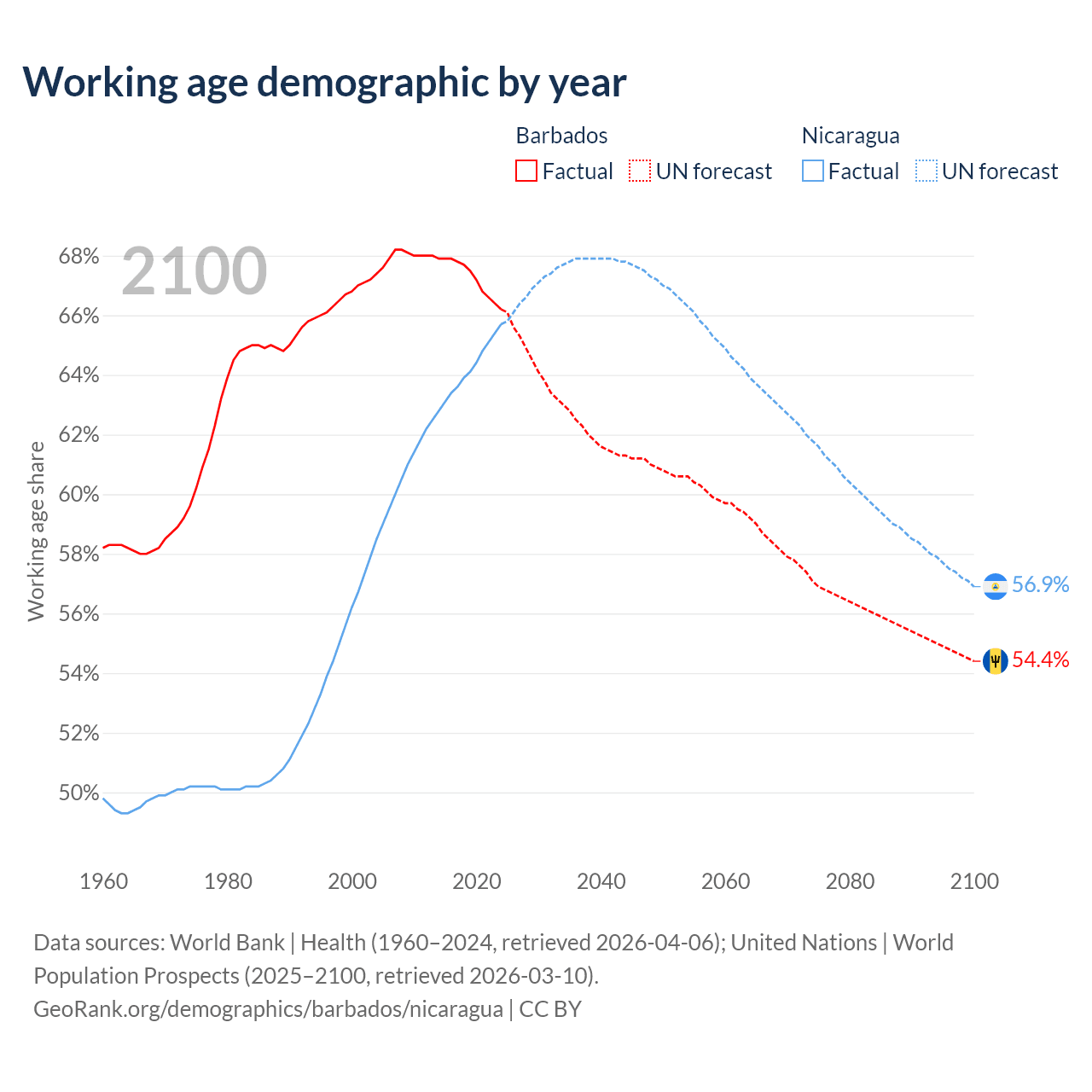 Median age Barbados vs Nicaragua, 1960-2100