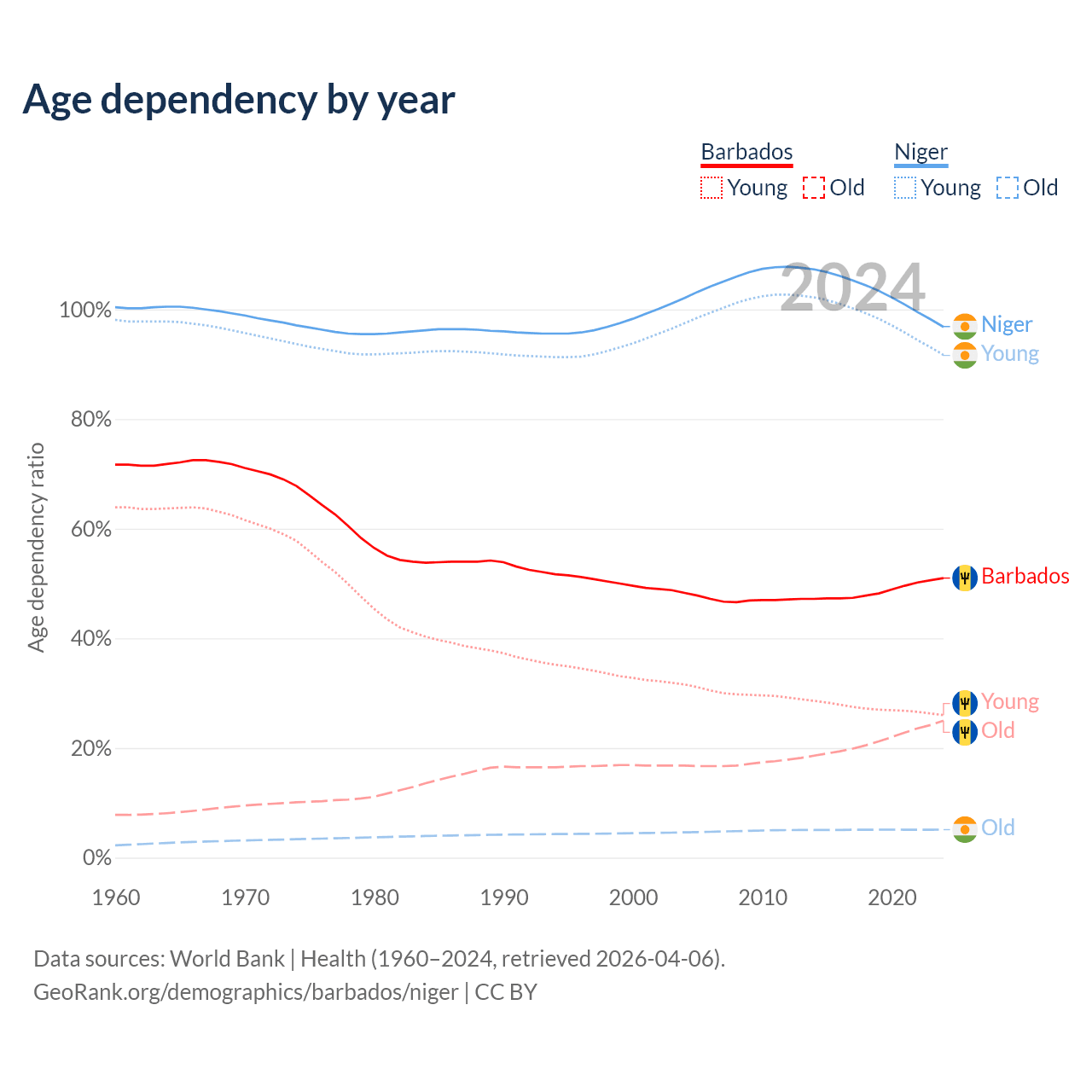 - Barbados is ranked 47/196 by median age (oldest to youngest) vs 195/196 for Niger.