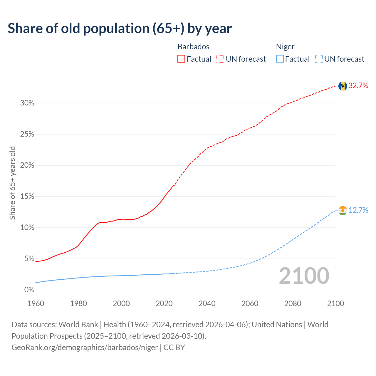 - The share of old-age demographic (65+) in Barbados is 16.6% vs 2.59% in Niger.