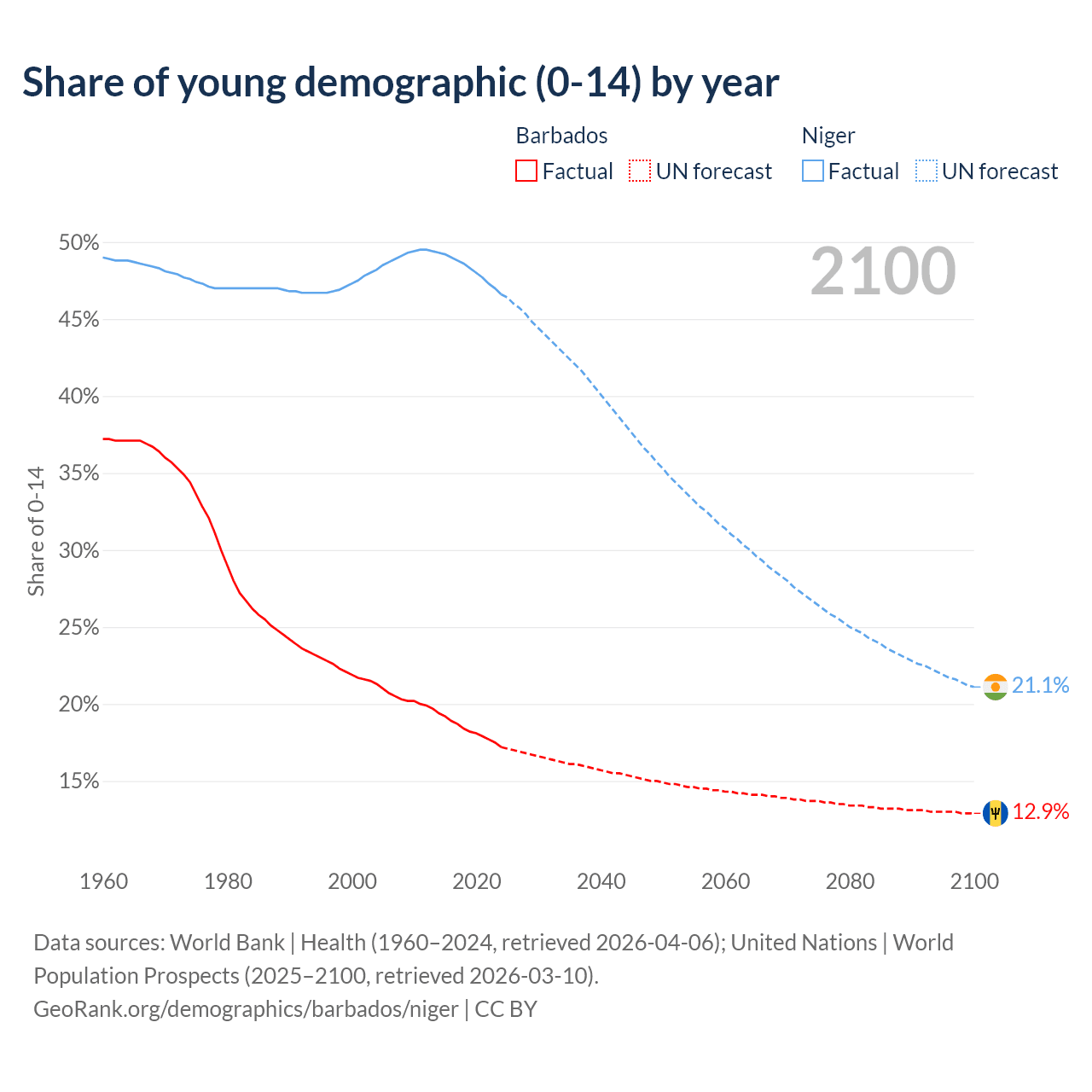 - The share of young demographic (0-15 years old) in Barbados is 17.2% vs 46.6% in Niger.