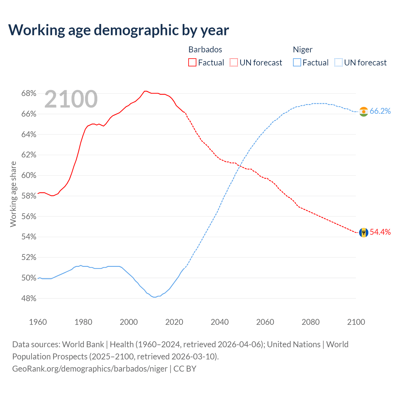 - Barbados has 187K working age adults (aged 15-64) vs 14.8M in Niger.