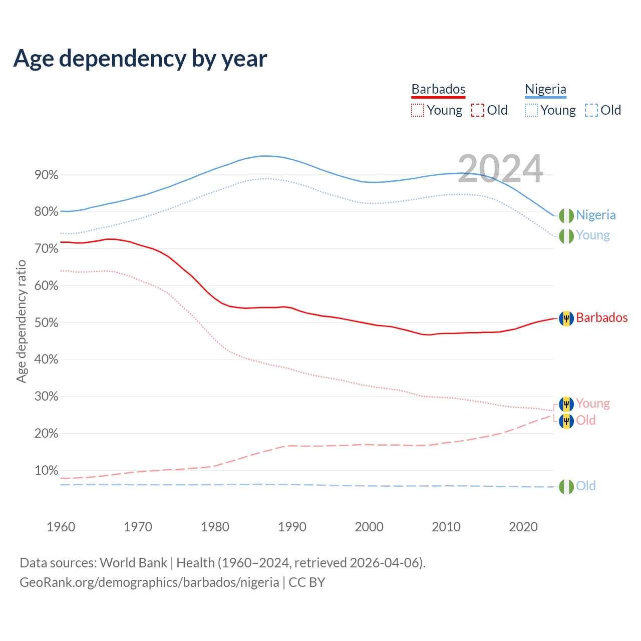 - Barbados is ranked 47/196 by median age (oldest to youngest) vs 178/196 for Nigeria.