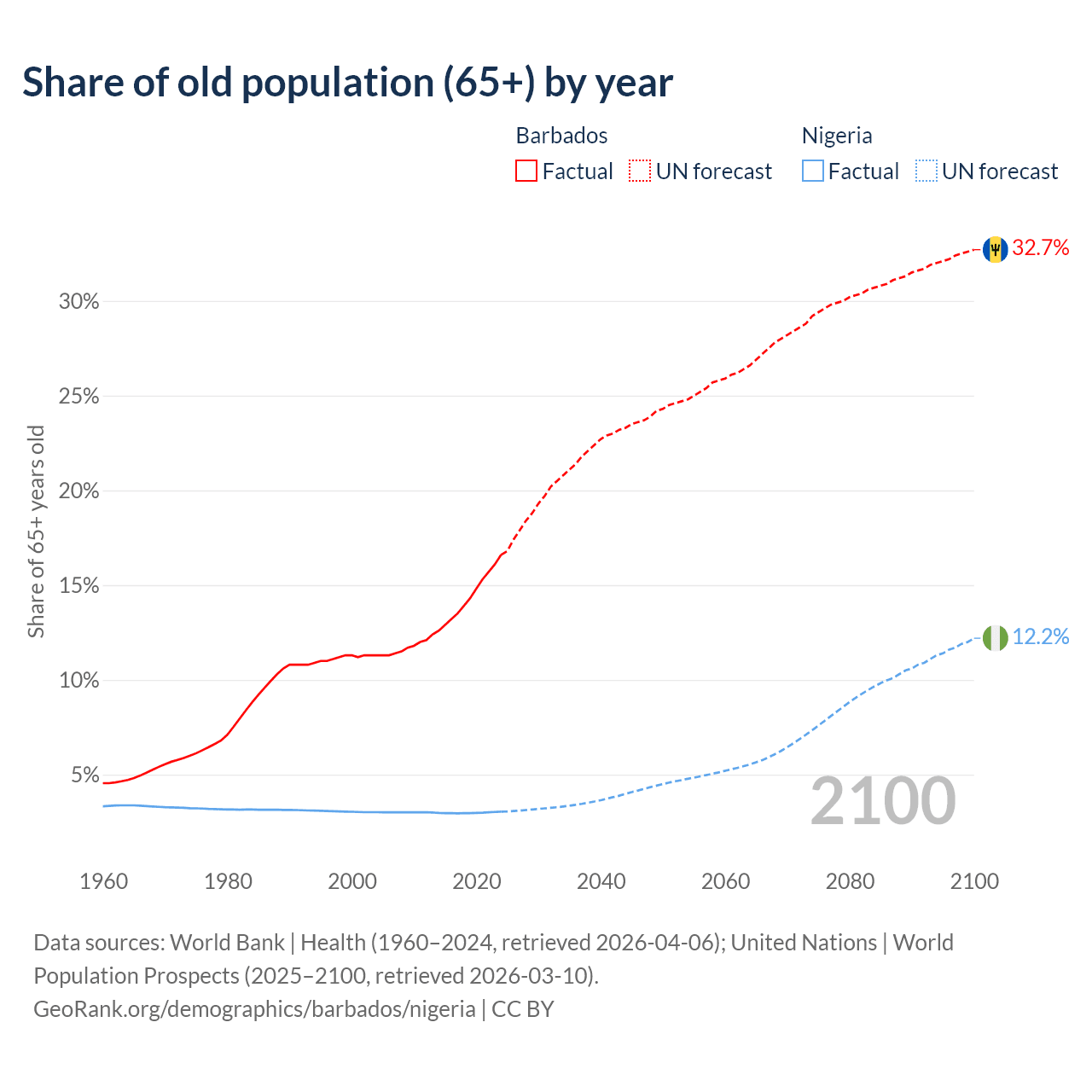 - The share of old-age demographic (65+) in Barbados is 16.6% vs 3.05% in Nigeria.