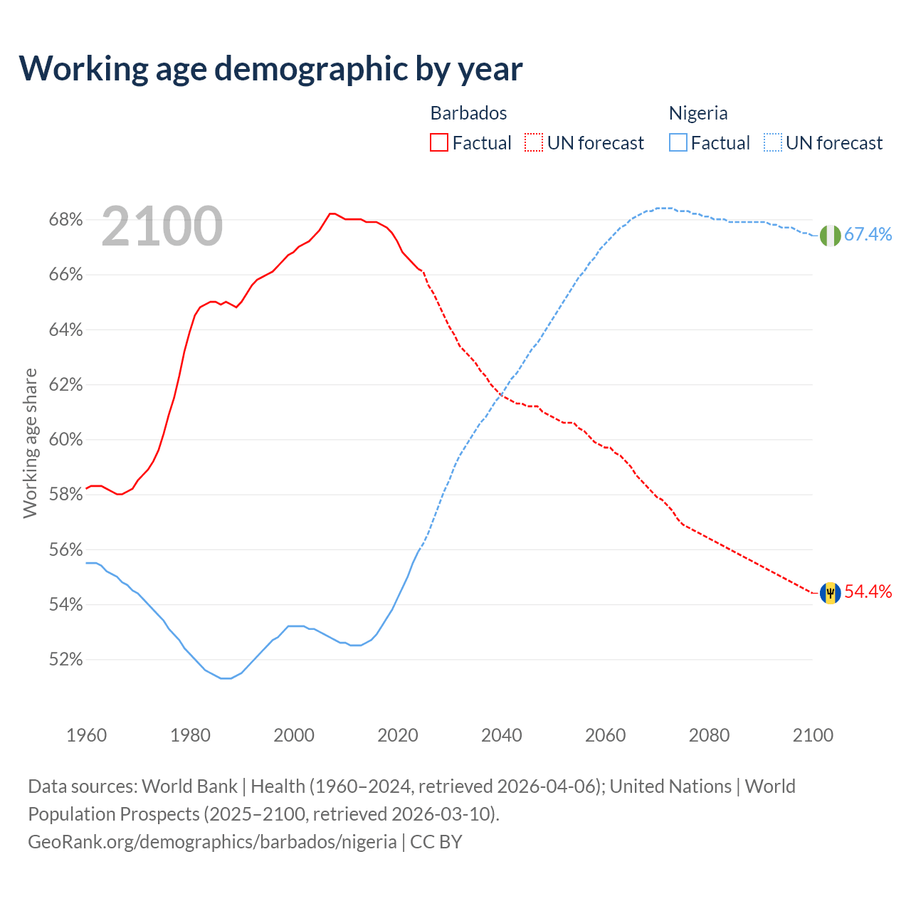 - Barbados has 187K working age adults (aged 15-64) vs 136M in Nigeria.