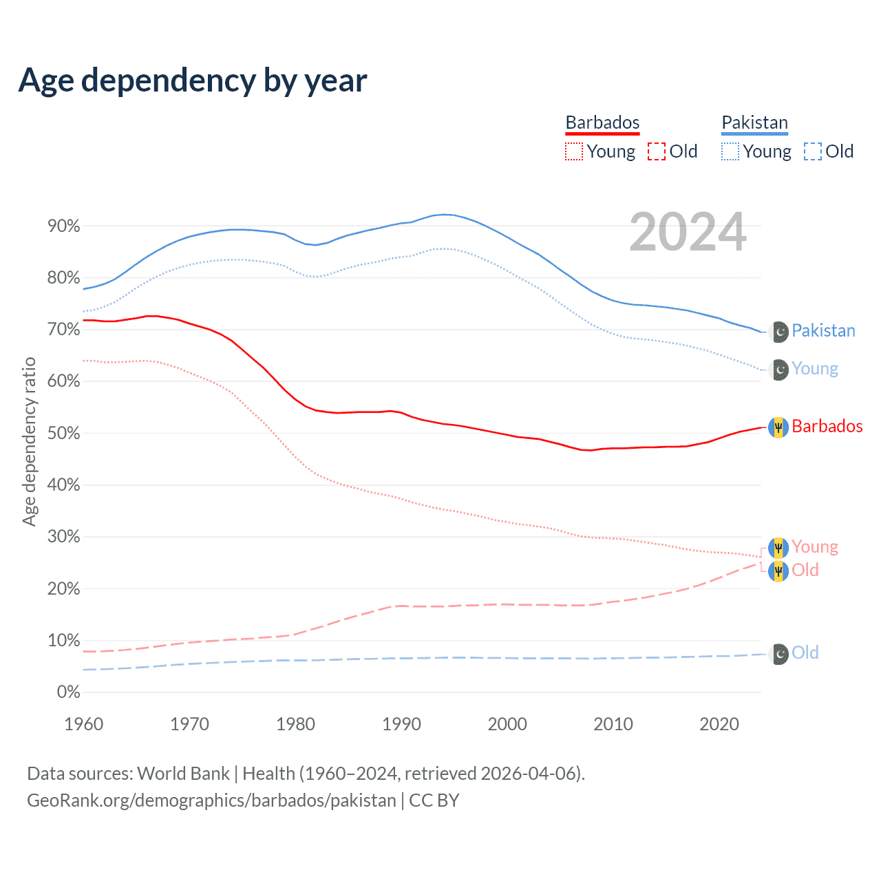 - Barbados is ranked 47/196 by median age (oldest to youngest) vs 154/196 for Pakistan.