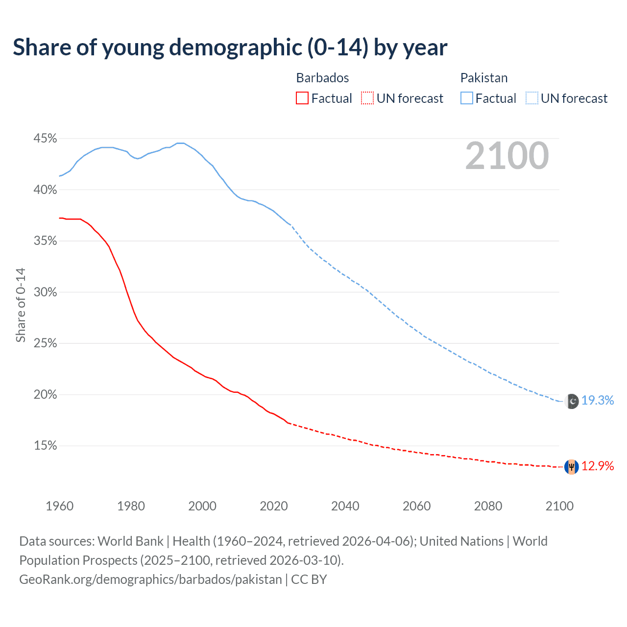 - The share of young demographic (0-15 years old) in Barbados is 17.2% vs 36.7% in Pakistan.