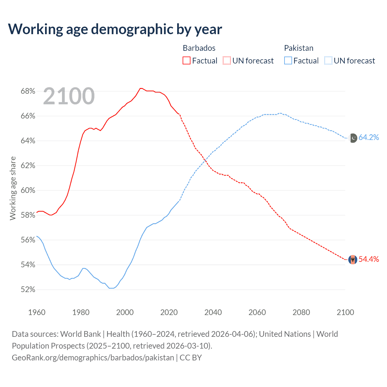 - Barbados has 187K working age adults (aged 15-64) vs 154M in Pakistan.