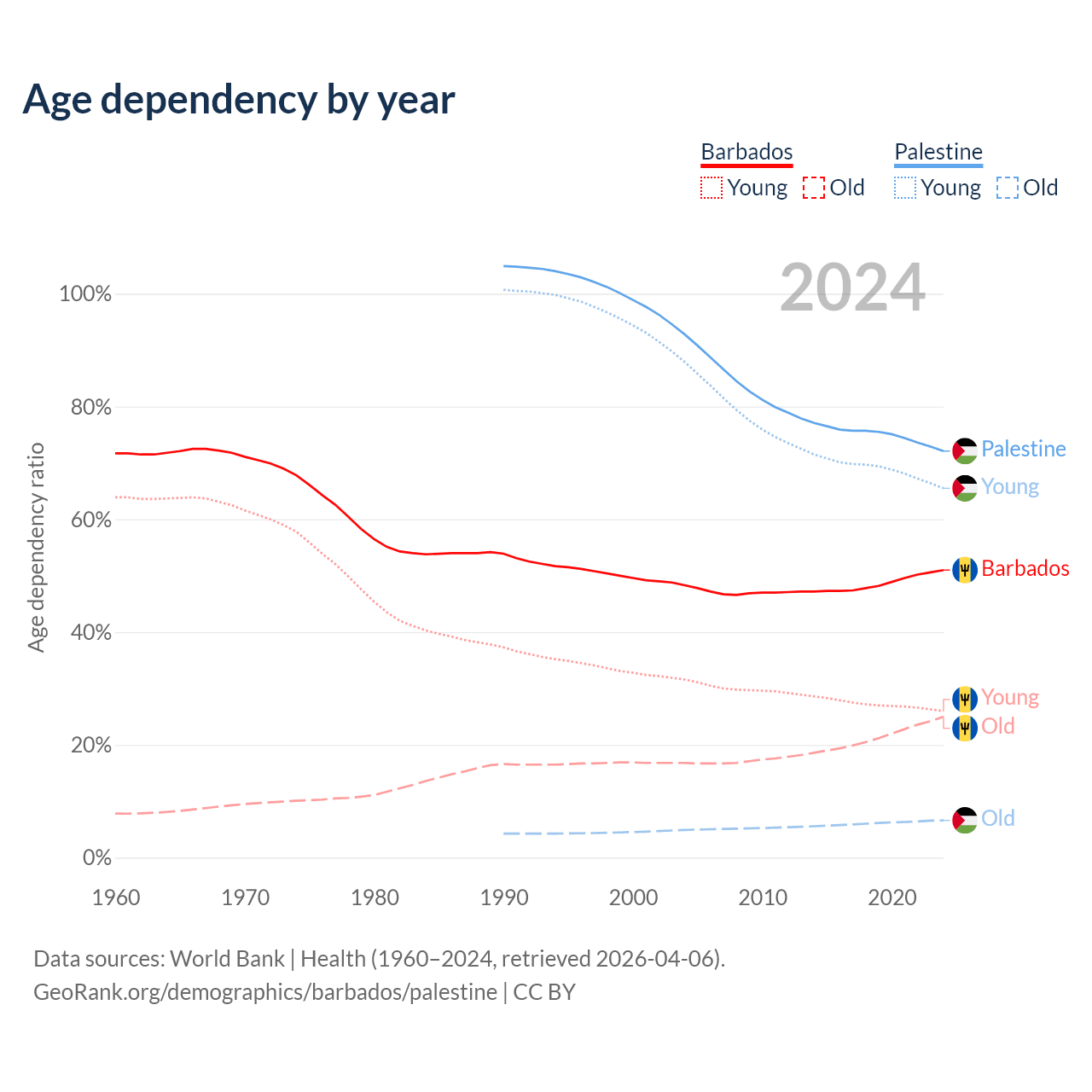 - The share of old-age demographic (65+) in Barbados is 16.6% vs 3.84% in Palestine.