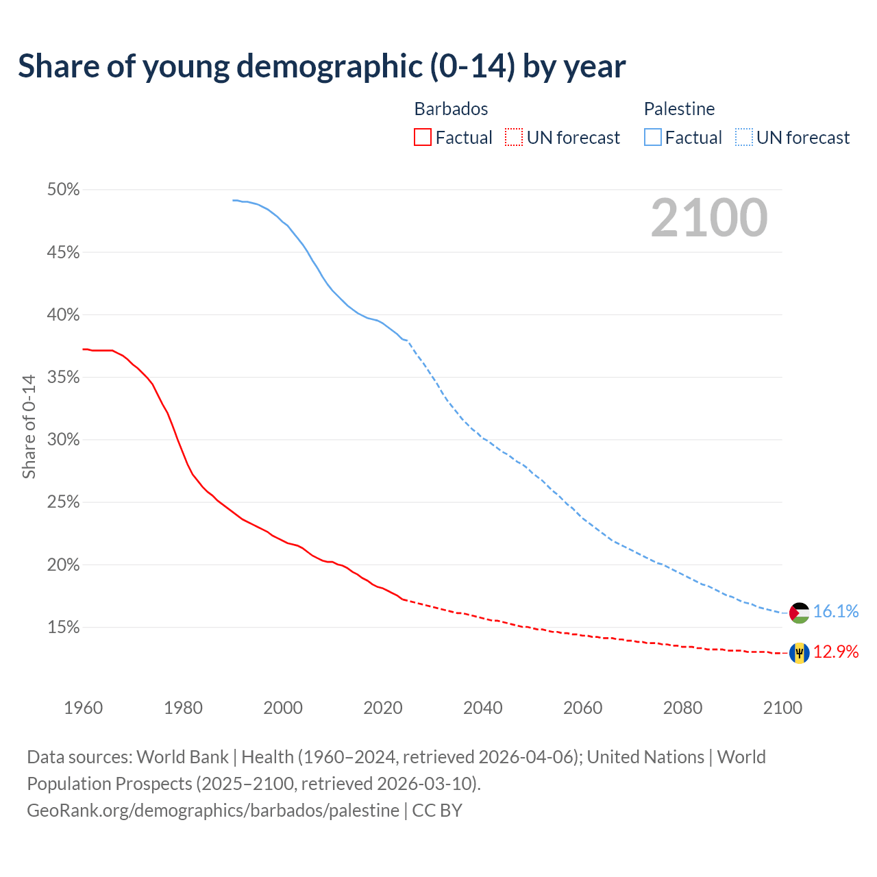 - The share of young demographic (0-15 years old) in Barbados is 17.2% vs 38% in Palestine.