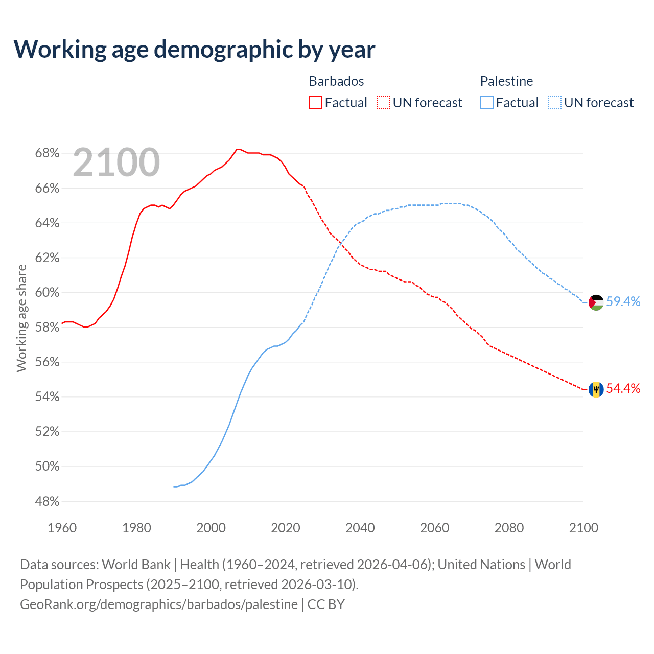 Median age Barbados vs Palestine, 1960-2100