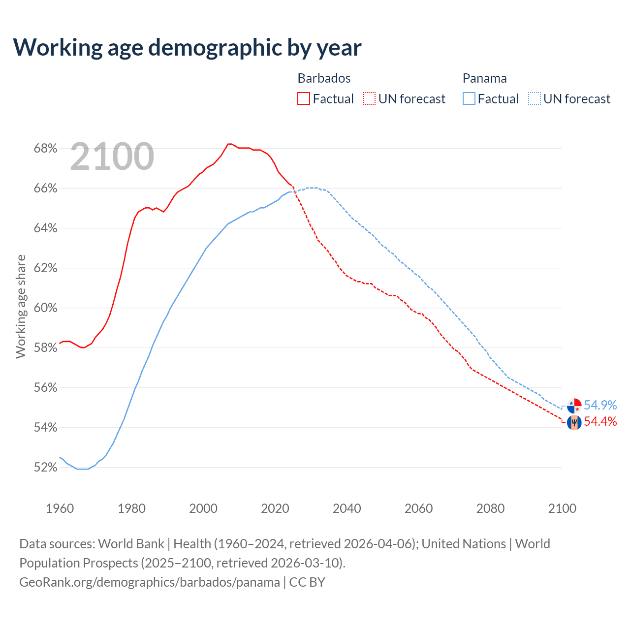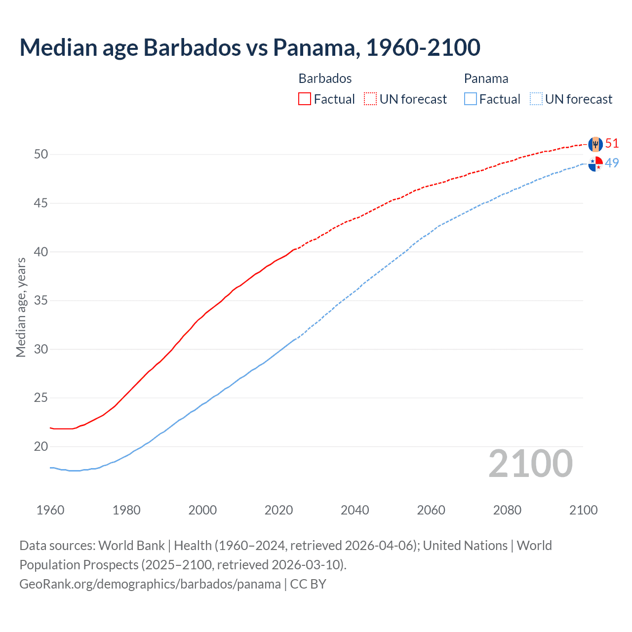 Median age Barbados vs Panama, 1960-2100