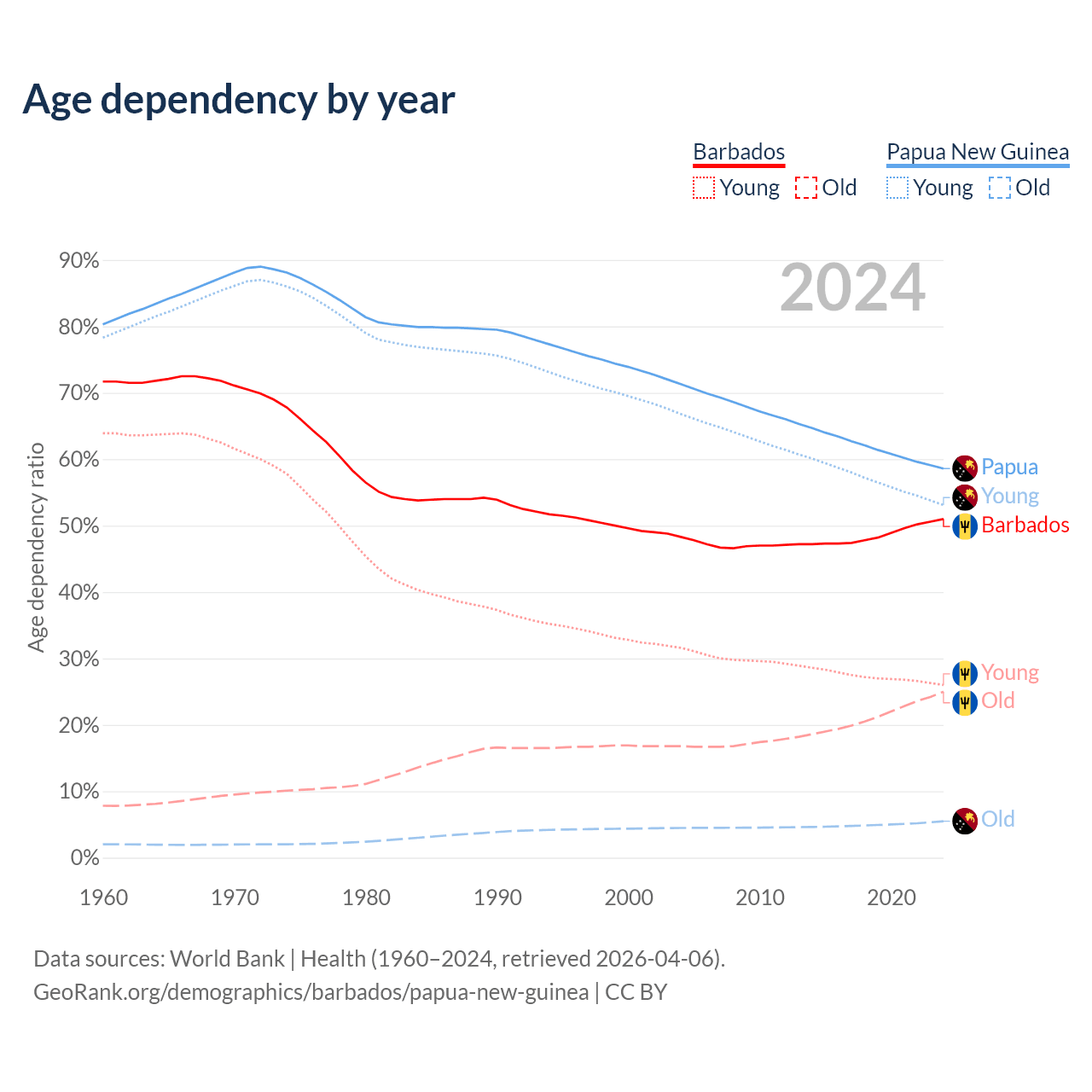 - Barbados is ranked 47/196 by median age (oldest to youngest) vs 140/196 for Papua New Guinea.
