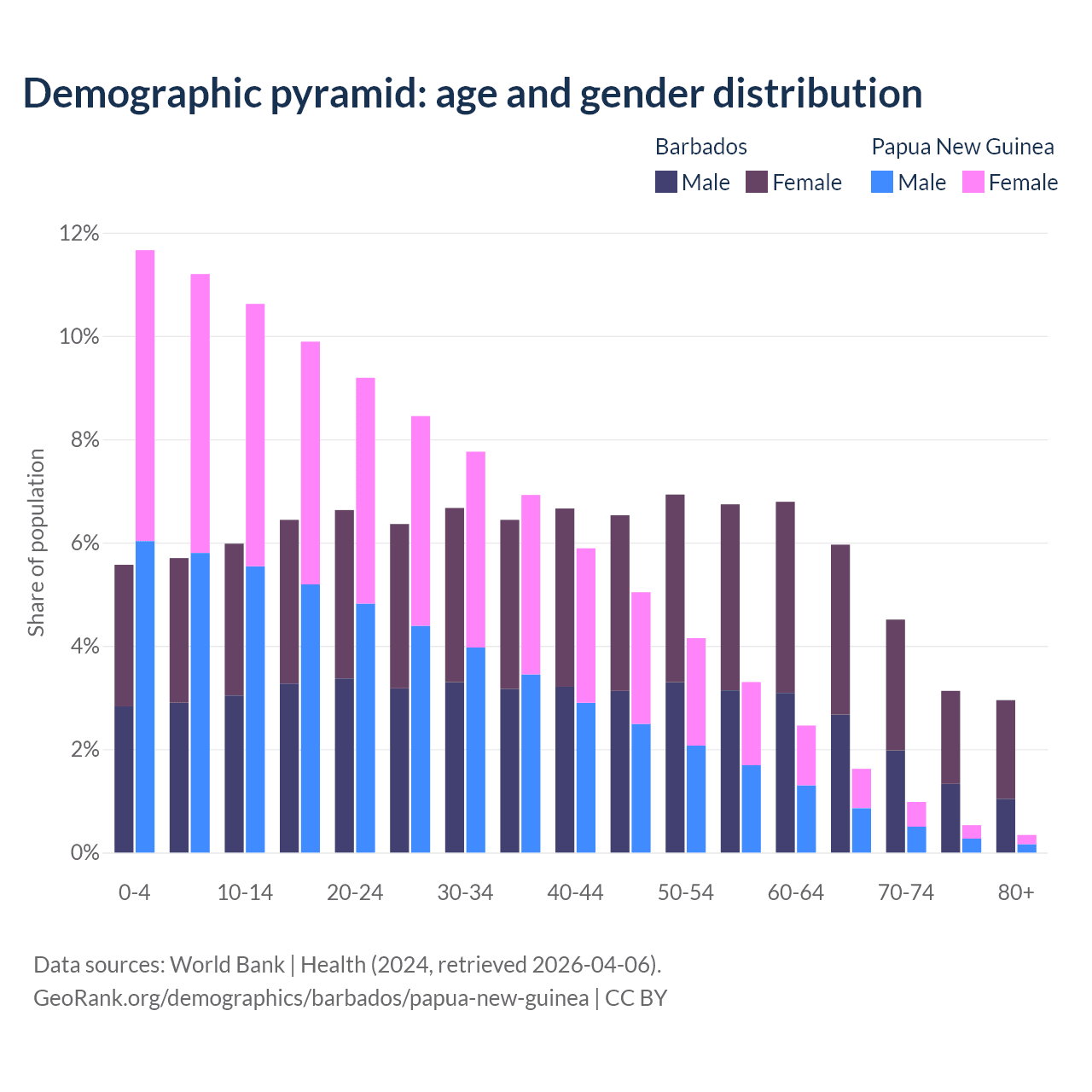 - As of 2026, the population of Barbados is 283K vs 11M in Papua New Guinea - 38.9 times difference.